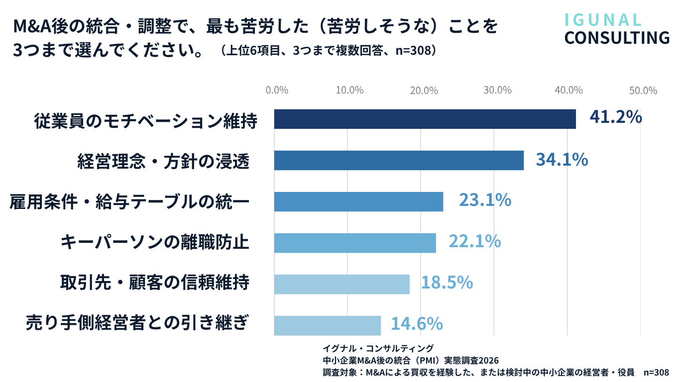 M&A後の統合で最も苦労したことは「従業員のモチベーション維持」(41.2%)、次いで「経営理念・方針の浸透」(34.1%)と、財務・法務よりも「人」に関わる課題が上位を占めた