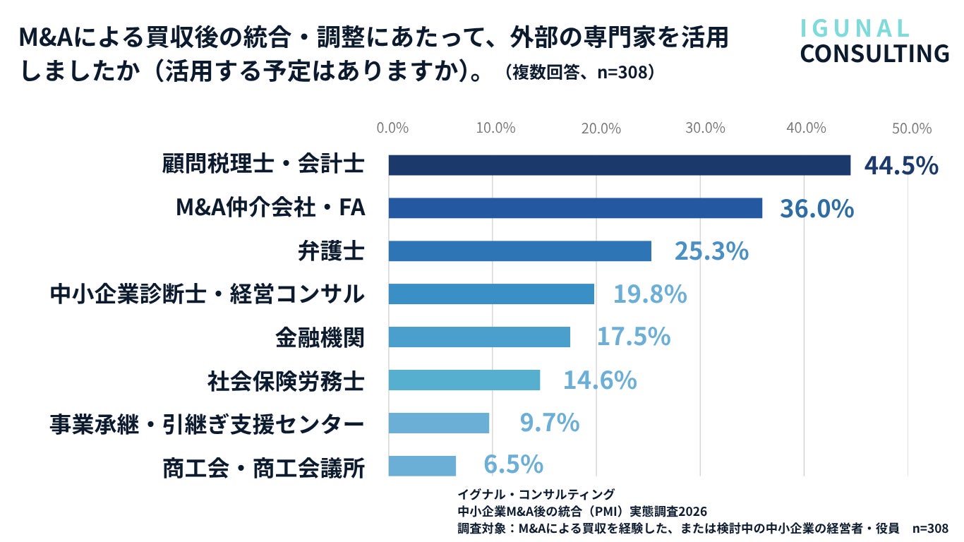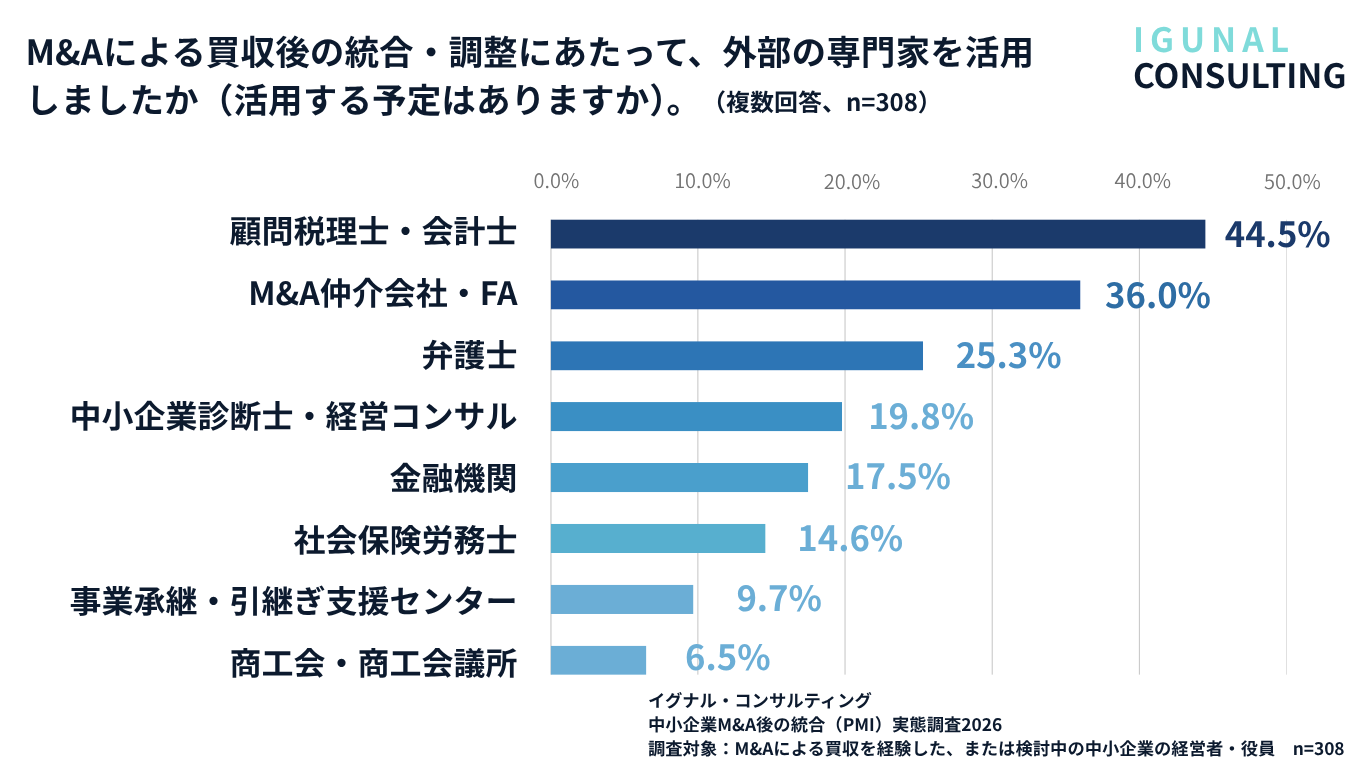 外部専門家の活用は、顧問税理士・会計士(44.5%)が最多で、M&A仲介会社・FA(36.0%)、弁護士(25.3%)と続きました。一方、組織・労務領域や経営計画の策定支援を担う中小企業診断士・経営コンサルタント(19.8%)、社会保険労務士(14.6%)の活用は2割前後にとどまっています。前述の通りPMIの苦労は組織・人事領域に集中していますが、その領域を専門とする専門家の活用がまだ広がっていない構図が見て取れます。
