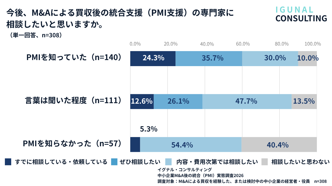 ■ 今後、M&Aによる買収後の統合支援(PMI支援)の専門家に相談したいと思いますか。(PMI認知度別/単一回答、n=308)