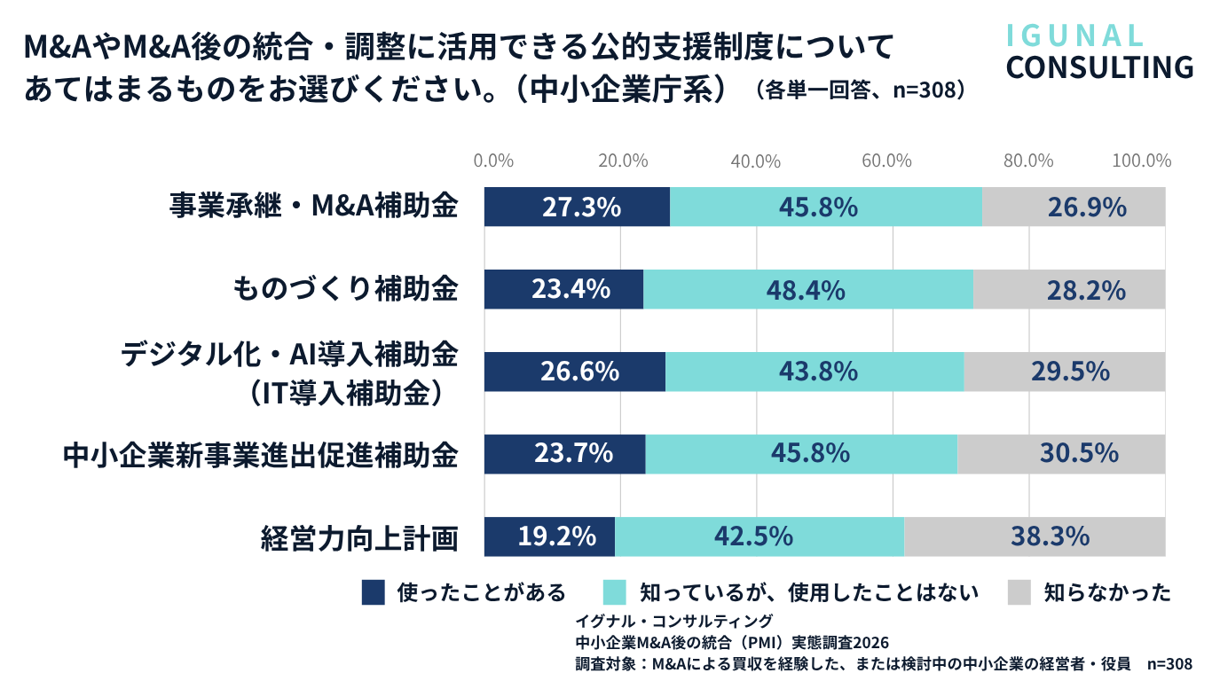 また、公的支援制度(補助金・助成金)の認知と活用の間にも大きなギャップがあり、「知っているが使えていない」状態が4割以上を占めます。情報源の中心が顧問税理士・金融機関・M&A仲介に偏っていることを踏まえると、PMIの実務領域における中小企業診断士・社会保険労務士などの存在感を高めること、また経営者が能動的に情報を取りに行ける窓口を整備することが、ギャップ解消の鍵になりそうです。