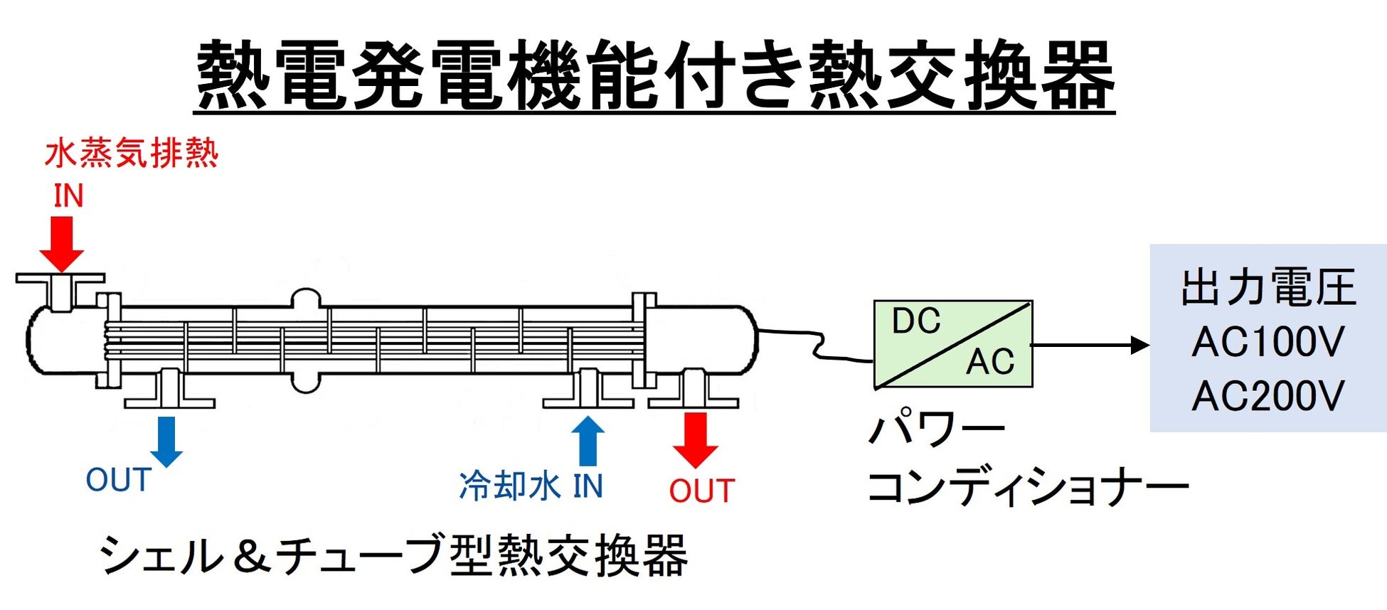 様々なプラントの様々な工程で発生する排熱を熱源として利用するため、様々なボイラを使って大量の水蒸気が作られています。その水蒸気は使用後、熱交換器を介して温排水に変換され、冷却塔で冷却され再利用されるか、廃棄されています。同社はこの「水蒸気排熱」の有効活用を目的に、コジェネレーション設備の有力メーカーである川崎重工業株式会社との共同開発により、NEDOの助成を得て、本モジュールを搭載した高効率の二重管熱電発電チューブと、それを使った6kW出力の熱電発電が可能なチューブ型熱交換器の開発・試作に成功しました。