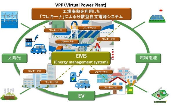 最近、災害に強い電力給配電システムとして、図6に示す分散型電源システムVPP(Virtual Power Plant) が注目を集めています。これは小規模の発電システムや蓄電池システムをネットワークで繋ぎ、需給バランスをとって電力の安定供給を図る電力給配電システムです。同社は以上述べた様々な独自技術を基に、今後工場や地域の排熱を利用し、この分散型電源システムにおける熱電発電システムとして、多くの方々の協力を得てその構築に貢献することを、将来の展望としています。