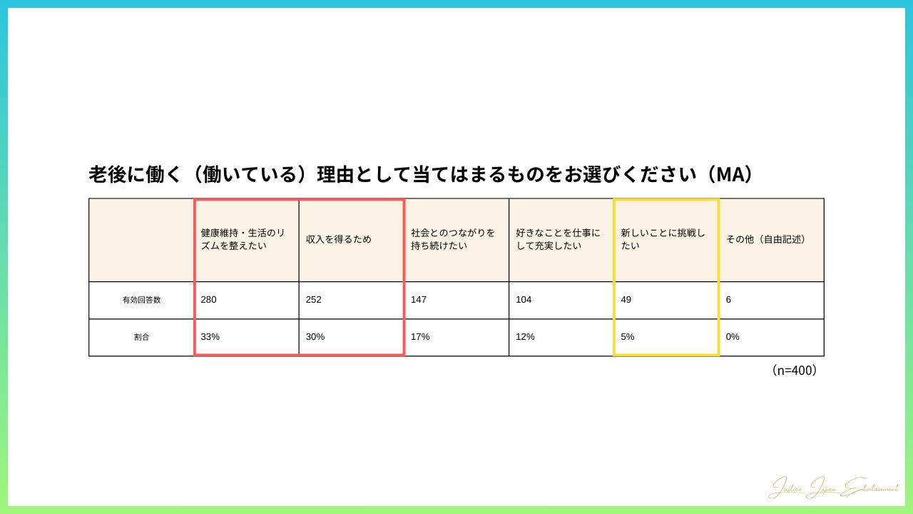 文化人などのマネージメント及びプロモーション業務をおこなう芸能プロダクション、株式会社ジャスティスジャパンエンターテイメント(本社:東京都港区、代表取締役:瀬川 丈)は、全国の40代〜70代の男女400名を対象に「老後の働き方とライフスタイルに関する意識調査を実施しました。