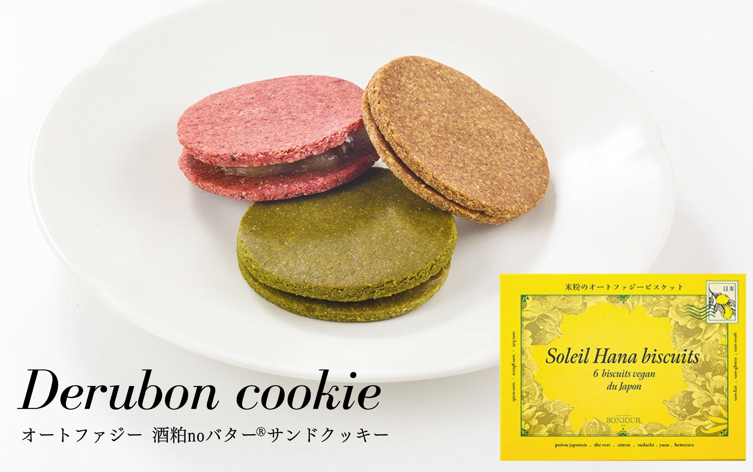 酒粕ベースのクリームを魚沼産コシヒカリ米粉のクッキー生地でサンド。素材はオーガニックとグルテンフリー(バター・白砂糖不使用)にこだわり。安心して楽しめるお菓子として、自然派食品を求める方に注目されています。