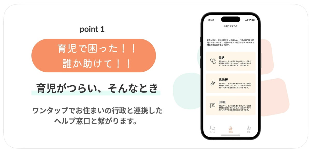 「助けてほしい」そんな時にアプリ上のSOSボタンで住んでいる地域の保健師さんに相談可能