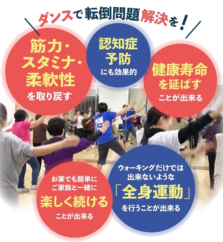 今や毎年交通事故で亡くなる方の3倍の方が転倒・転落によって亡くなっています。転倒予防啓発ソングとダンスを作り、楽しく転倒予防をする事で転倒で亡くなる方を一人でも減らし、健康長寿の社会を目指します。