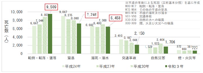 ・令和3年の転倒・転落・墜落死者数:10202人。(交通事故死者数3536人の約3倍)