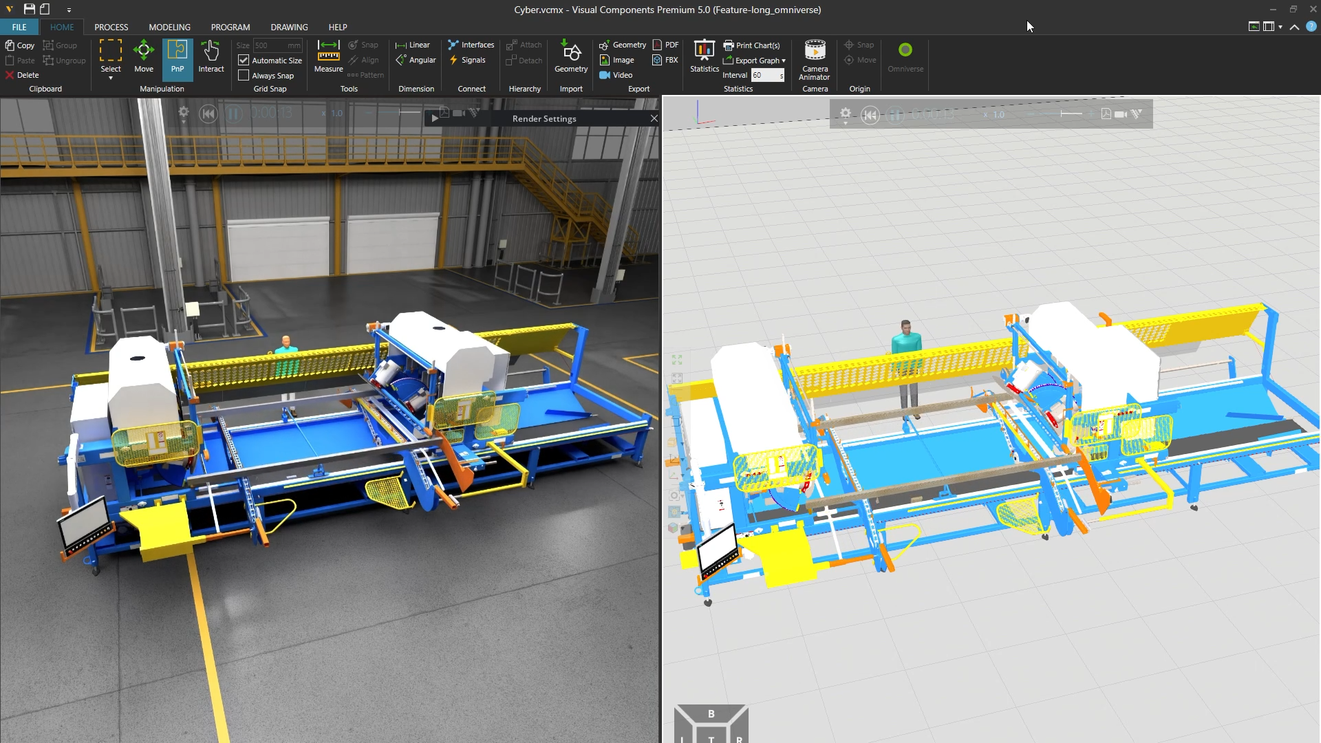 新しいビューポートはリアルタイムで高精細なレンダリングを実現します。シミュレーション環境で行われる全ての更新を即時に反映することで、照明や資材の状況をリアルタイムに表示します。これにより、製造業者やシステムインテグレーターは、これまでのVisual Componentsのワークフローとシームレスに適合しながら、より現実的かつ明瞭な工場レイアウトの検討・レビューが可能になります。モデルの再構築と追加ソフトウェアの利用やプロセス変更も不要で、形状・構造・資材を自動的にNVIDIA Omniverse搭載のビューポートに反映できます。これにより、製造業者やシステムインテグレーターは、これまでのVisual Componentsの環境内で、施設のレイアウトをより直感的かつ効果的に可視化・確認・共有できる新たな手法を活用できるようになります。
