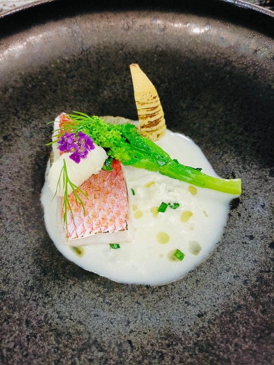 ディナーメニューより ~屋久島 尾長鯛を54℃のコンフィにて 桜島大根の藁焼き添え~