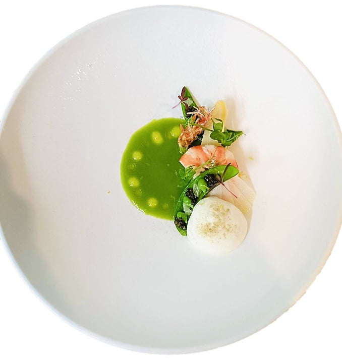 ランチメニューより ~指宿市産のえんどう豆と白姫海老 ホワイトアスパラガス添え~