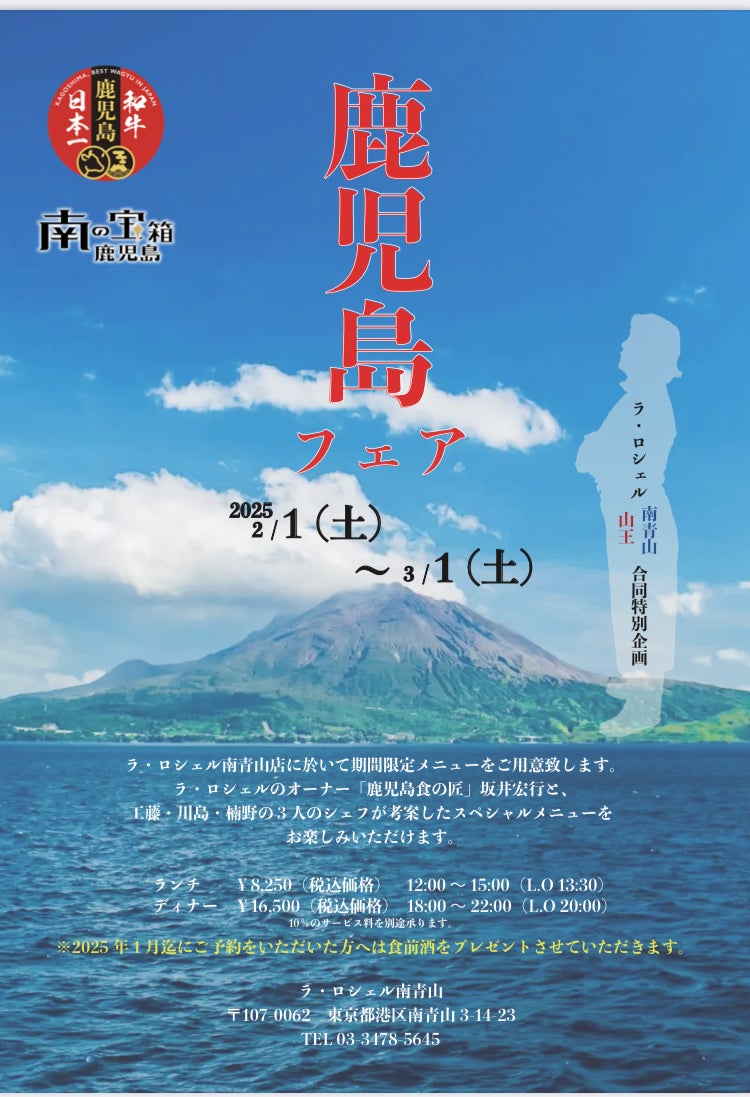 フランス料理店 ラ・ロシェルを運営する 株式会社サカイ食品(本社:東京都渋谷区、代表:坂井慎吾)は、2025年2月1日より、表参道にあるラ・ロシェル南青山店(総料理長・川島 孝)にて鹿児島県食材フェアを開催中。エグゼクティブシェフの工藤敏之、総料理長の川島 孝、山王店料理長の楠野 大の3名のシェフによる特別コースをお楽しみいただけます。