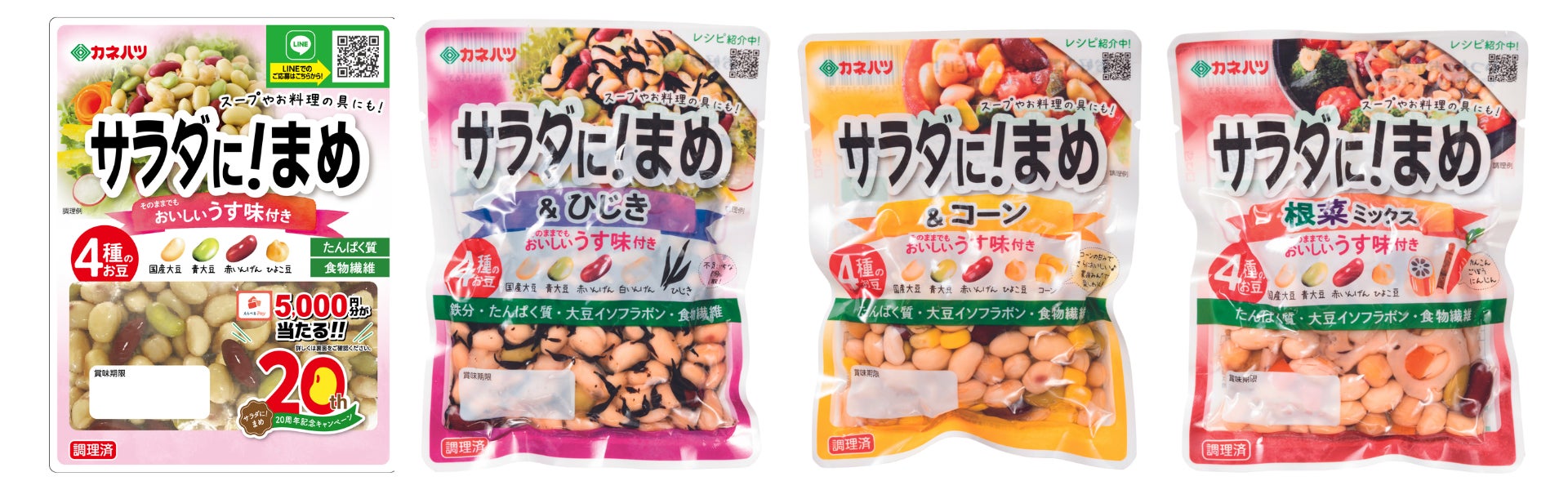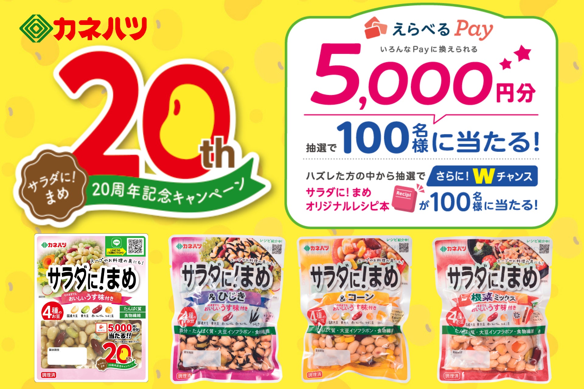 佃煮・煮豆・惣菜・おせちのカネハツブランドを展開するカネハツ食品株式会社(本社:愛知県名古屋市、代表取締役社長:加藤英敏)は、2025年4月に「サラダに!まめ」が発売20周年を迎えたことを記念し、「サラダに!まめ20周年記念キャンペーン」を4月1日(火)から5月31日(土)まで実施いたします。