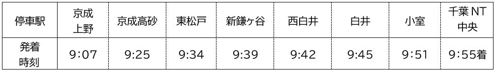 ※全停車駅:京成上野→日暮里→青砥→京成高砂→東松戸→新鎌ヶ谷→西白井→白井→小室→