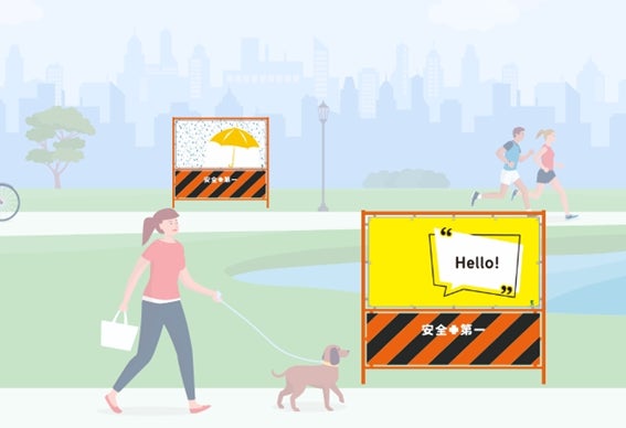 通常、工事現場の周辺に置かれるフェンスのメッシュ部分を覆うフェンスシートの役割は目隠しです。そのため、デザインも画一的でデザインされたものはほとんどありません。工事現場は本来、周囲を歩く、住んでいる人にとっても、「この場所に何ができるのだろう?」「どう便利になるのだろう?」とこれから出来上がっていく新しい街並みにワクワクとした高揚感とキラキラとした華やかさを感じられる場所であるはずですが、現実は殺風景なフェンスで味気ない風景になっています。