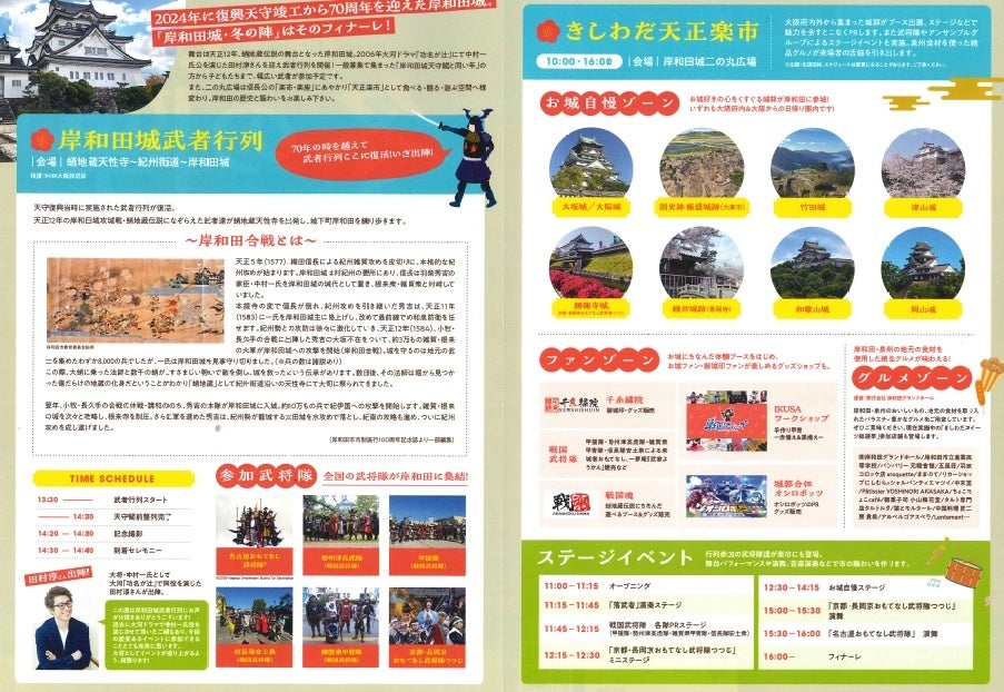 2024年11月、岸和田城は天守復興から70周年を迎えました。メモリアルイヤーである2024年度は、春・夏・秋と年間を通じイベントを実施してまいりました。締めくくりとなる「冬」、岸和田城冬の陣と題し、70年前・昭和29(1954)年の天守復興時に行われたと云われる武者行列を復活! タレント 田村淳さんを大将に、総勢100名の武将隊が、紀州街道を練り歩く『岸和田城武者行列』、 岸和田城二の丸広場では、『天正楽市』を開催いたします。