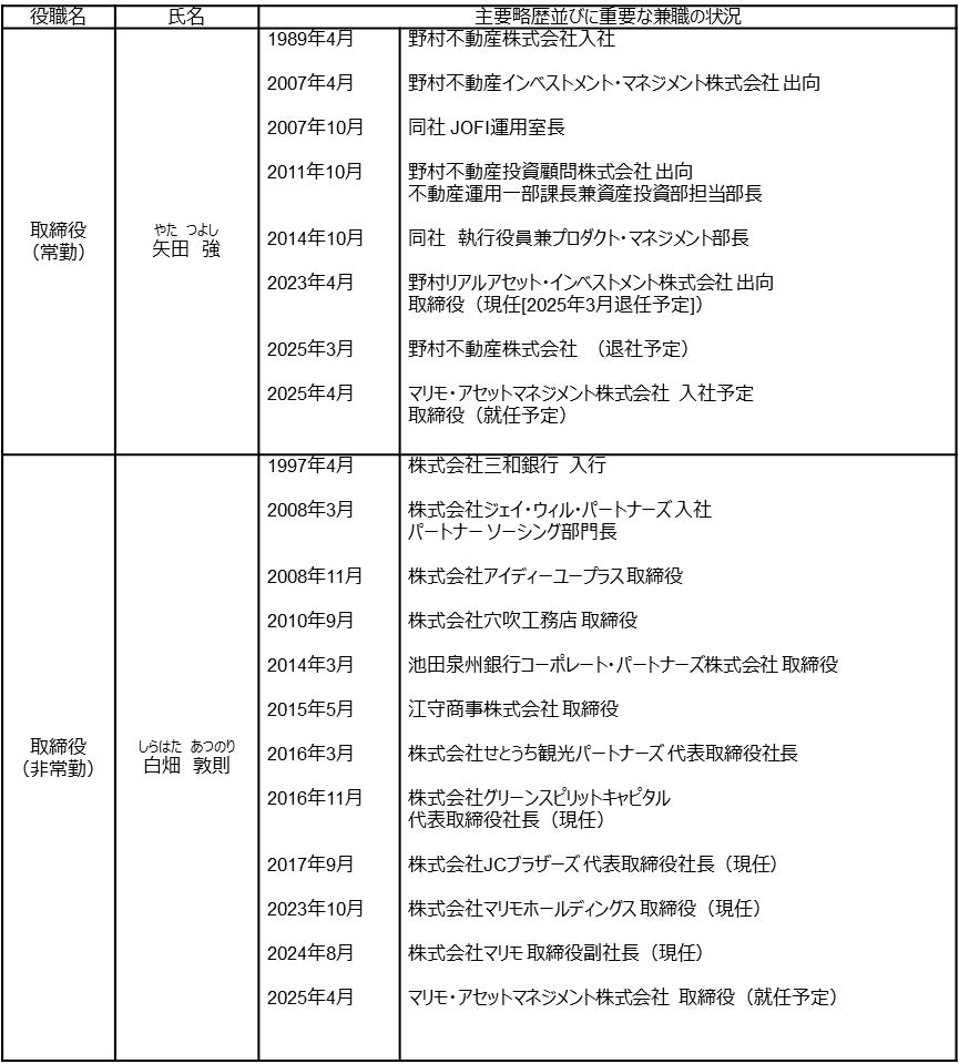 矢田氏は1989年野村不動産株式会社入社以来、住宅部門にて住宅販売・企画・開発業務を18年間経験。その後資産運⽤部門へ異動し約1,000億円の収益不動産(オフィス・ 商業・物流)の開発に従事しました。直近の約10年間は私募不動産ファンドに特化し、野村不動産投資顧問の私募ファンド事業全般を執行役員として統括し、2023年3⽉末時点において私募ファンド事業は30ファンド・AUM約2,400億円規模となり、資産運⽤部門における収益源の成長に寄与しました。白畑氏は株式会社ジェイ・ウィル・パートナーズを退職後、2016年に株式会社グリーンスピリットキャピタルを設立し、同年よりマリモホールディングスのアドバイザーとしてグループ経営全般の業務に従事し、現在は株式会社マリモ取締役副社長を兼務しております。