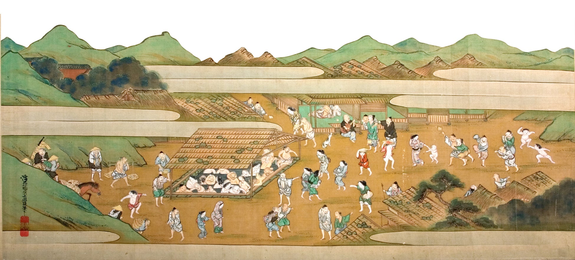 ⼭中温泉の成り⽴ちが描かれた絵巻。橋⽴の船頭らが⼭中温泉を訪れ、総湯で湯浴みを楽しむ姿が描かれています。⼭中温泉の温泉縁起絵巻は、総湯や温泉の精神が受け継がれてきた⼤切なものです。