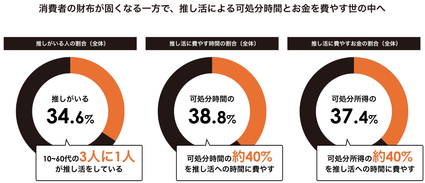 また"推し活"は可処分時間と可処分所得の約40%を費やし、熱狂的な消費行動として注目が高まっています。