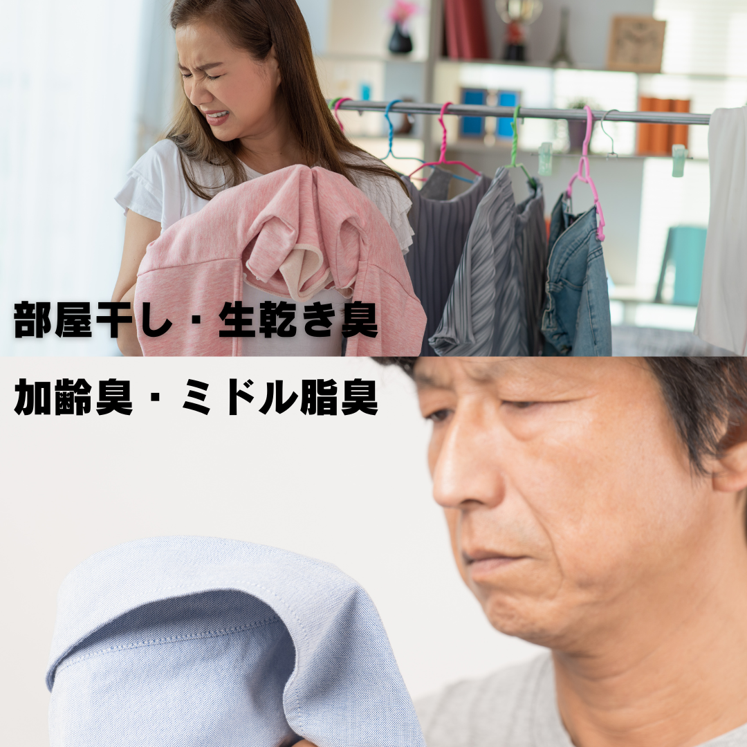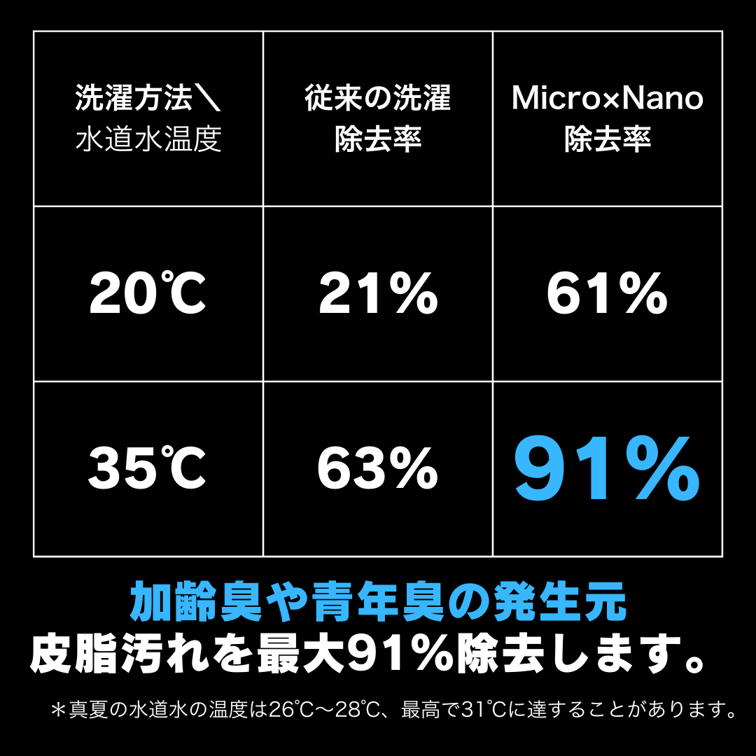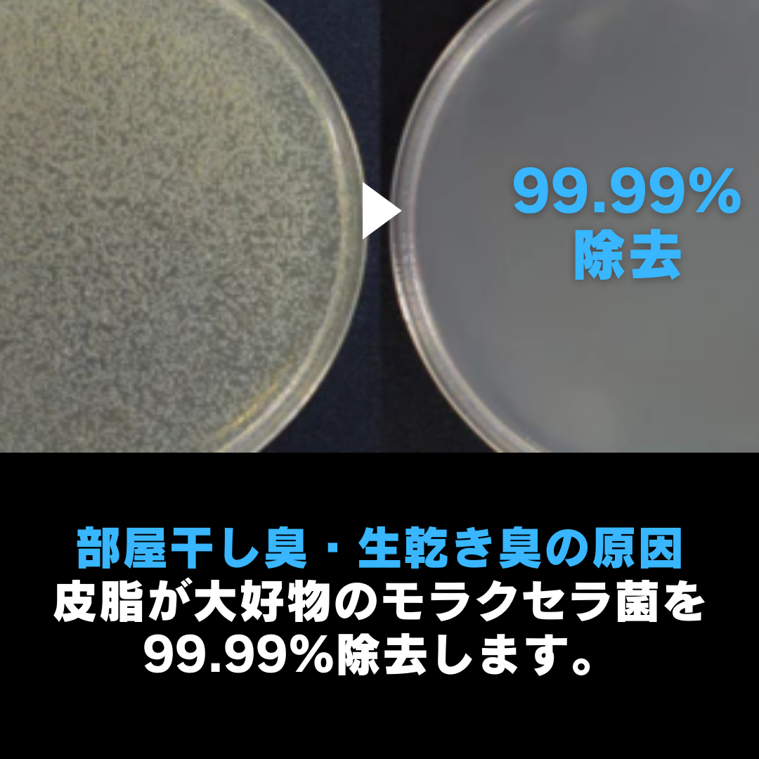 部屋干し臭はモラクセラ菌の発生で起こりますが、この菌は皮脂汚れが大好き。皮脂汚れは加齢臭・ミドル脂臭・青年臭の原因でもあります。マイクロとナノの二刀流バブルがはたらくことで、最大モラクセラ菌を99.9%、皮脂汚れを91%除去します。