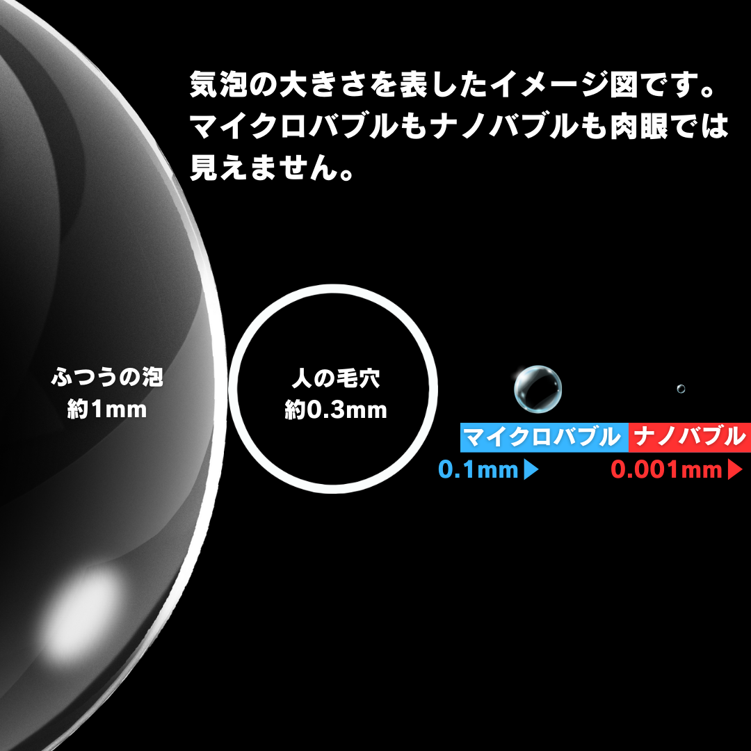 アダプターを30秒で洗濯機に付けるだけで、二種類の極小バブルが1億個/ml発生します。まず髪の毛1/3ほどのマイクロバブル。これが浮力を受け浮上しながら、洗濯物表面の汚れや皮脂汚れにアタックしはぎとります。もう一つは髪の毛1/800のナノバブル。さらに微細な気泡が振動しながら繊維内に入り込み、しつこいニオイの元を掻きとります。