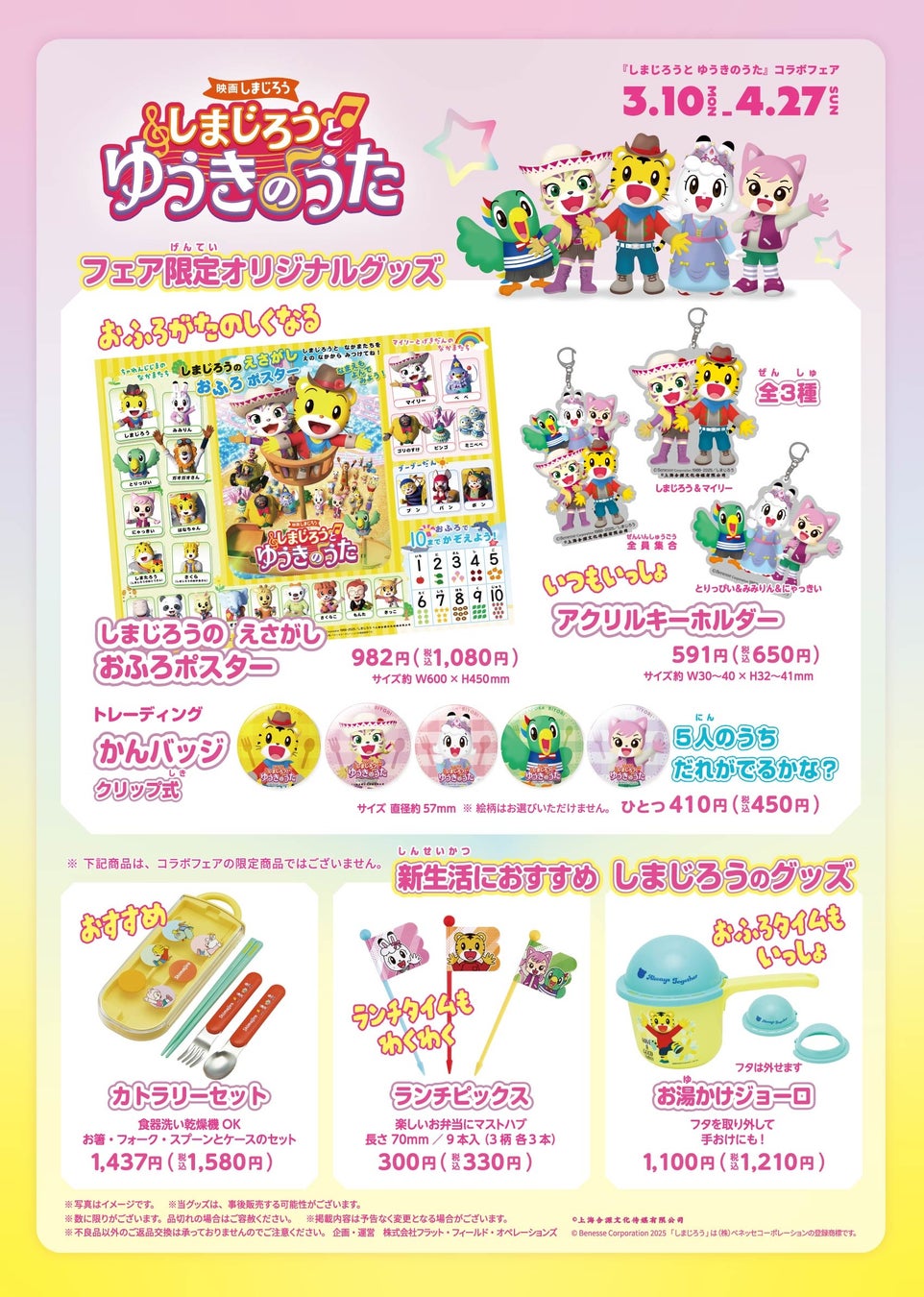 当フェア限定のグッズは3商品。映画「しまじろうと ゆうきのうた」のキービジュアルを使った「絵さがしお風呂ポスター」は、おうちでのお風呂時間も楽しめるオリジナル商品です。また定番のアクリルキーホルダー、缶バッジには当フェア描き下ろしのイラストを使用。缶バッジは小さなお子様も安心して使える「クリップ式」バッジになっています。さらに、しまじろうの人気定番グッズの中から、春のお出かけやおうちのお風呂タイムが楽しくなる商品をラインナップしています。