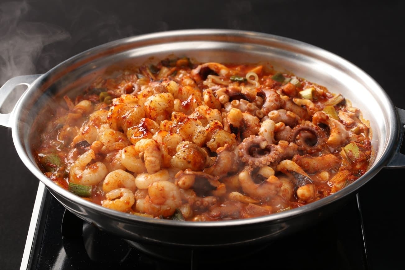 名物ナッコプセは、韓国から直送される手長だこ=“ナッチ”、ホルモン=“コプチャン”、えび=“セウ”の頭文字を組み合わせた、釜山の港町ならではの郷土料理として知られるピリ辛の鍋料理で、テーブル上のコンロで加熱し、具材が煮える過程も楽しむことができます。