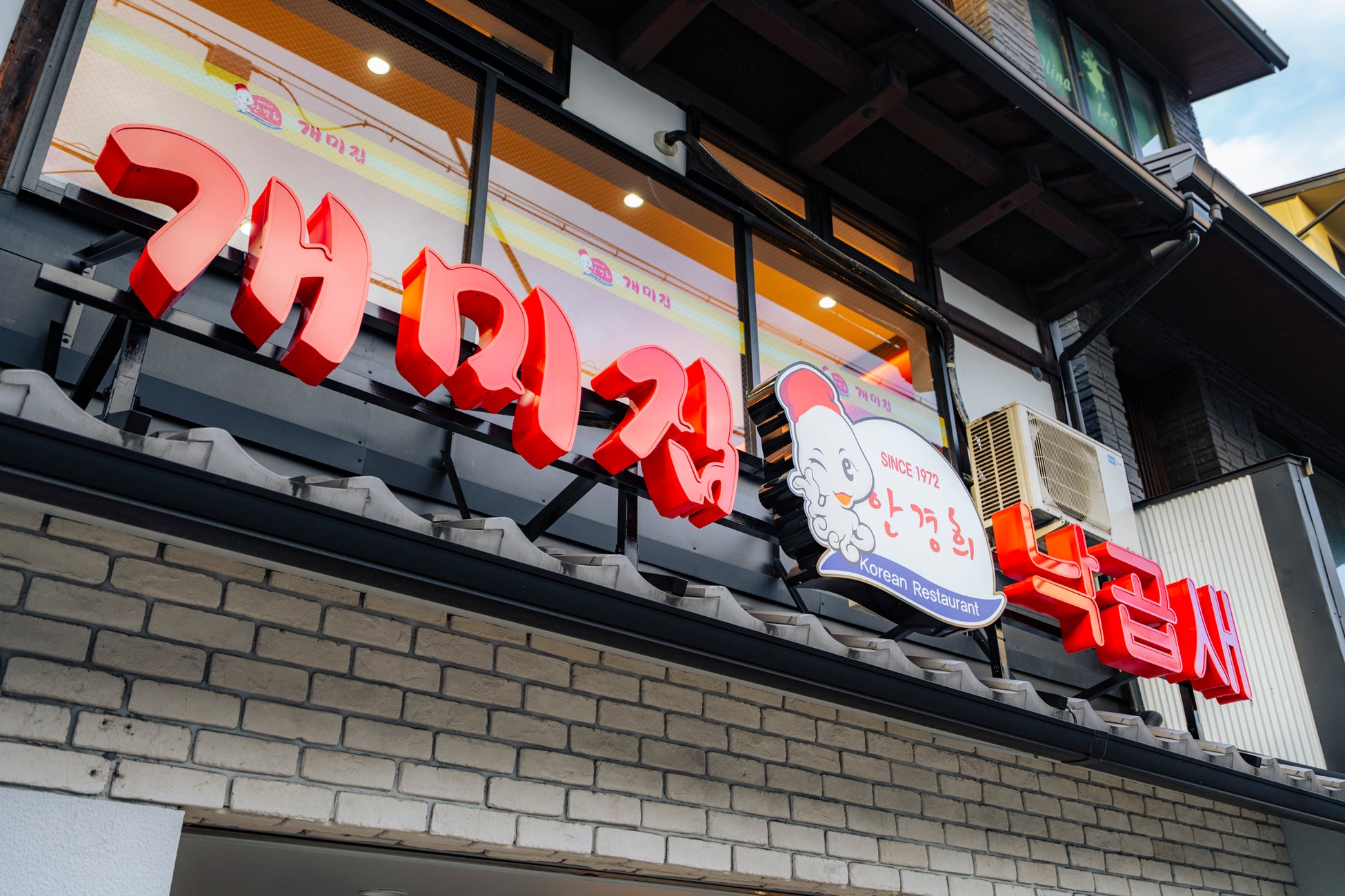 店舗は京都駅北側・京都らしい町家が軒を連ねる中に大正~昭和初期のレトロモダン建築が点在する七条通に位置しています。内装は釜山ケミチプの店内設計担当者によるデザインを元に壁や床、照明も本場の雰囲気を忠実に再現。特にハングル文字をあしらったアクセント壁は韓国から壁紙を輸入し使用しています。