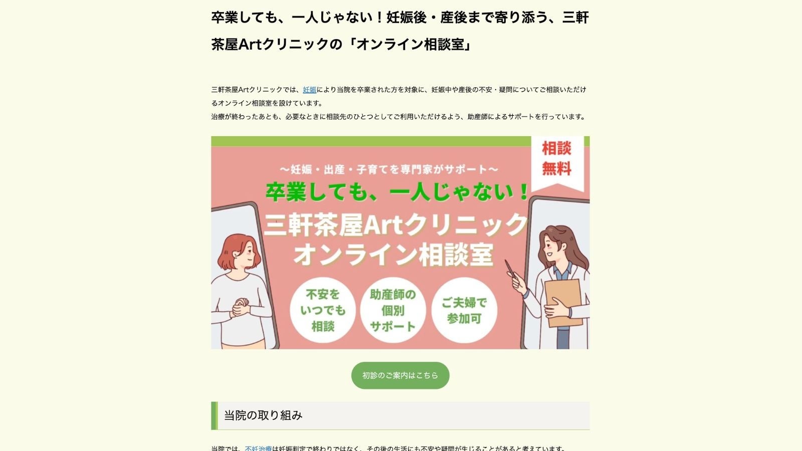 三軒茶屋Artクリニック(所在地:東京都世田谷区三軒茶屋1-37-2 三茶ビル5F、院長:坂口健一朗)は、妊娠により当院を卒業された方を対象に、妊娠中や産後の不安・疑問について助産師へ相談できる「オンライン相談室」を実施しています。