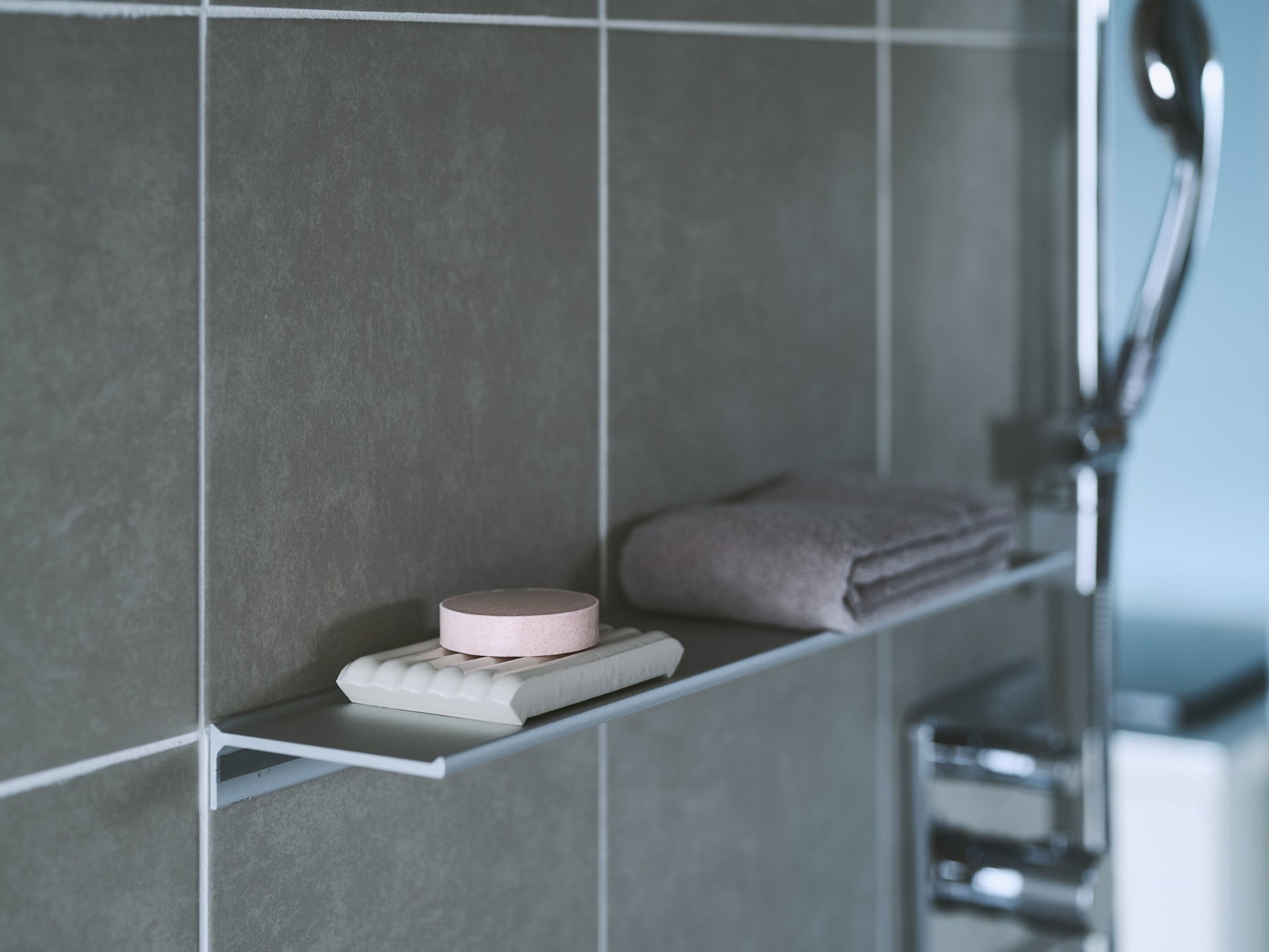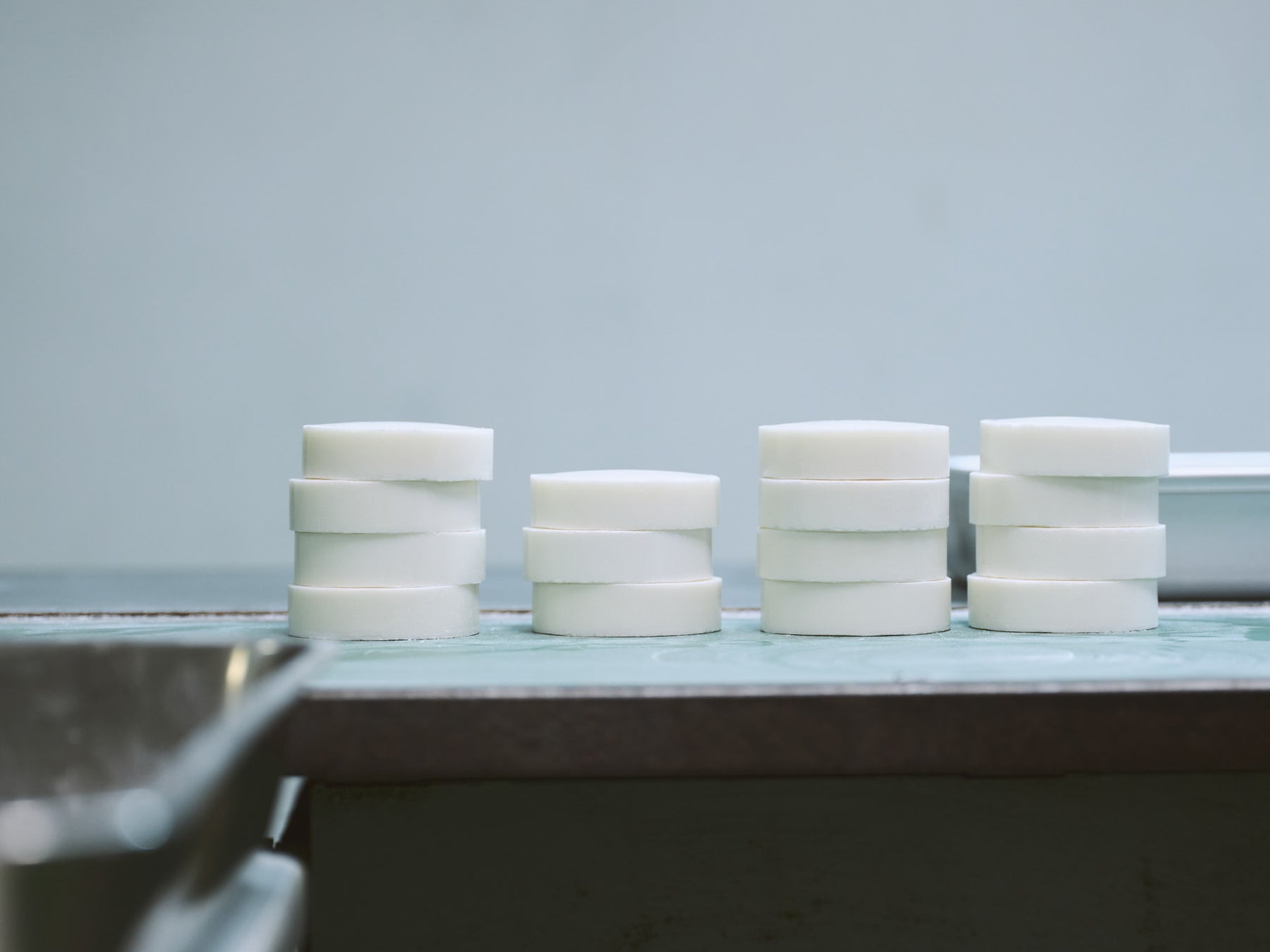 原料を真空状態にしながら約90tの圧力で一気に押し固めることにより、お風呂でも溶け崩れせず、とても長持ちで、最後までしっかり使うことができます。そのため、通常の枠練りや機械練りの石鹸に比べて、2倍以上のロングライフです。