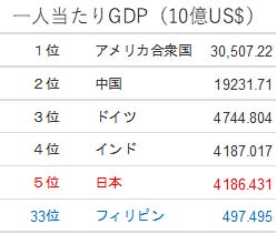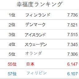 一人当たりGDPに裏打ちされるように、物質的にも衛生的にも恵まれた日本。しかし、幸福度ランキングではフィリピンとの差はわずか0.14ポイント(順位にして2つ)しか差がありません。