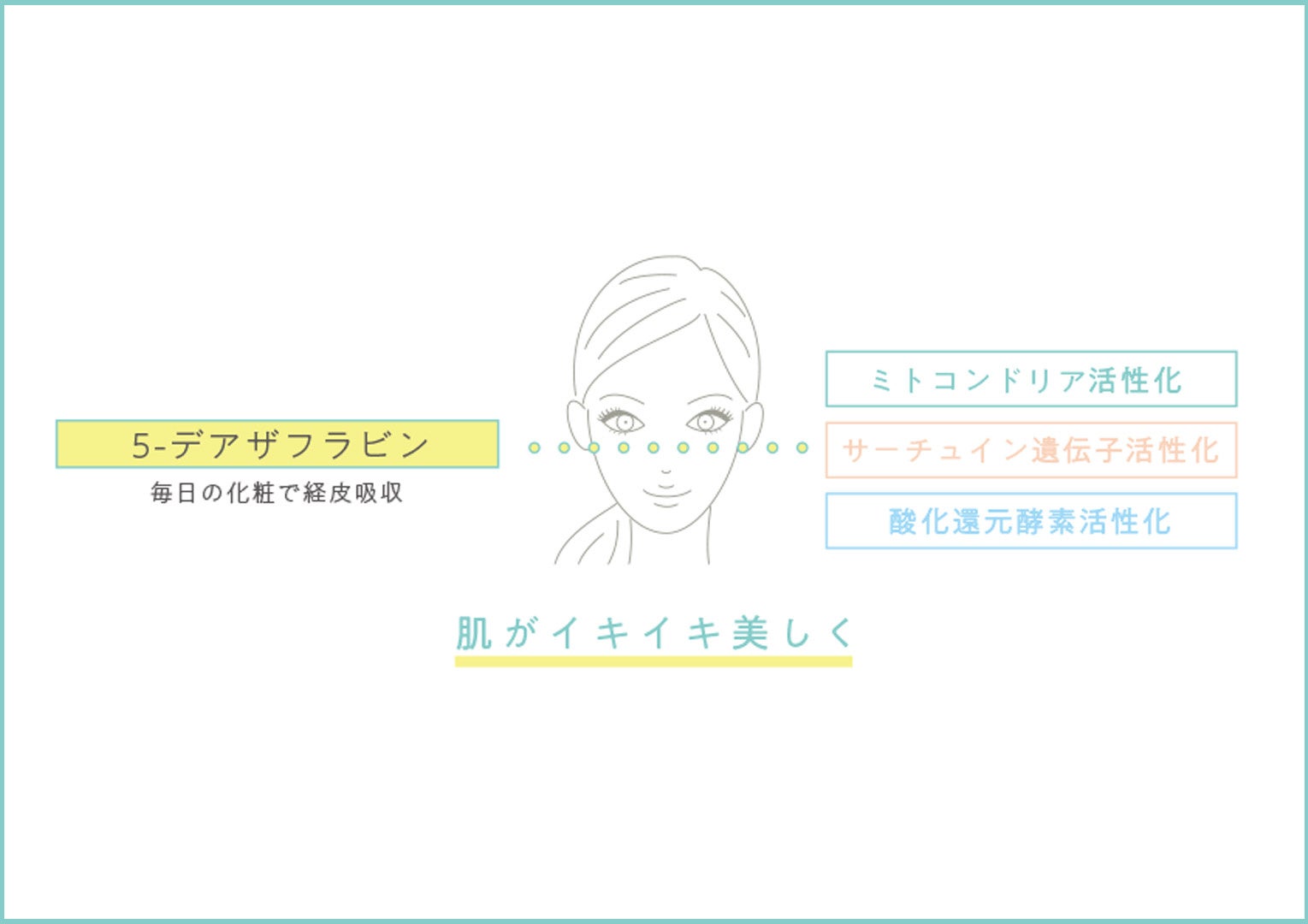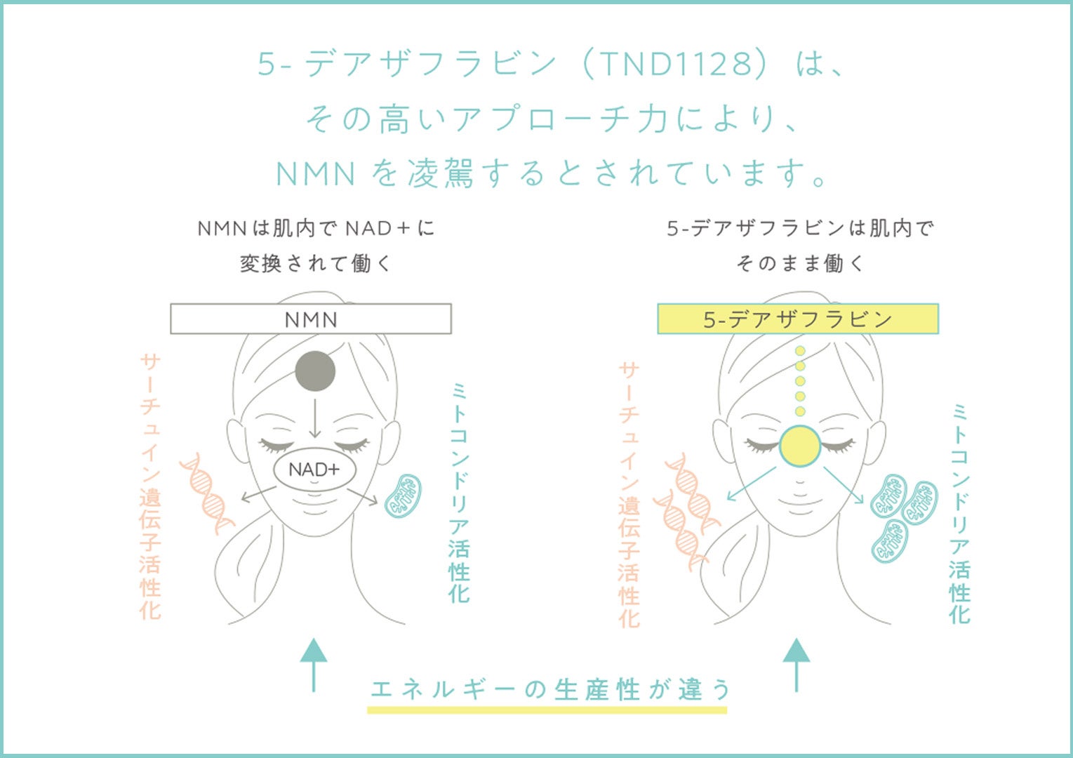 『5-デアザフラビン』(※2)は1960年代に発見され、近年では世界的権威のあるスウェーデンの医科大学でノーベル生理学・医学賞部門の選考委員会がある「カロリンスカ研究所」や日本の大学にて研究が進められている「ビタミンB₂に似た構造を持つNAD+の類似作用成分」です。ミトコンドリア活性化、酸化還元酵素活性化、サーチュイン遺伝子活性化において、NMNの何倍ものパワーを持つことが実証された国際特許取得素材として世界から注目を集めています。つまりは細胞レベルから「健康寿命の延伸作用」「抗酸化作用」があると言える(※6)『5-デアザフラビン』(※2)を肌から直接取り入れることを実現しました。