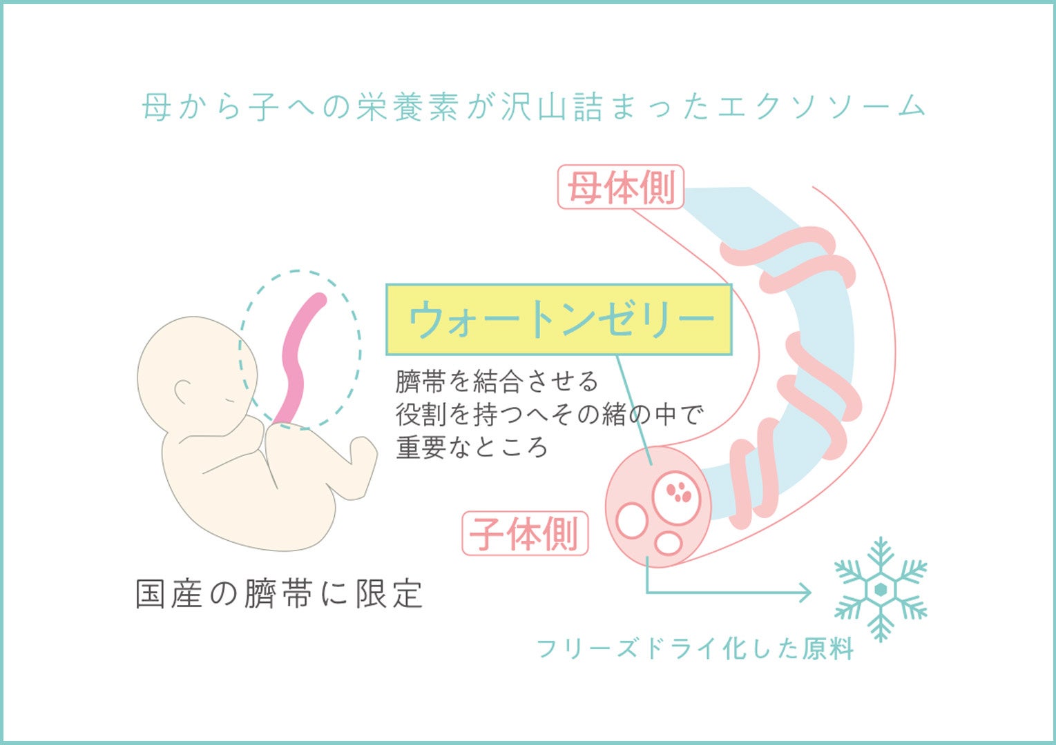 『エクソソーム』(※3)は、細胞が分泌し、体内で細胞と細胞、臓器と臓器の情報コミュニケーションを担う物質です。脂質二重膜のカプセルに入ったナノ粒子で、幹細胞から放出されるとほかの細胞に入り、細胞同士のコミュニケーションを取り持ちます。特に間葉系幹細胞の『エクソソーム』は血管や皮膚などを若々しく保つ効果があるとされ、エイジングケア(※1)に役立つと言われています。déjunでは、細胞の中で最も若い赤ちゃんのへその緒の“ウォートンゼリー”から採取された国産限定のヒト臍帯間葉系幹細胞『エクソソーム』を採用しています。