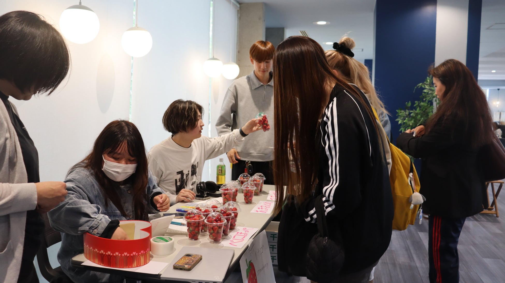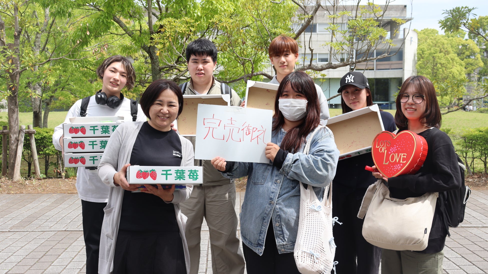 このプロジェクトは国武教授が担当するゼミナールの学生や千葉東金キャンパス5学部から参加する「域学共創プロジェクトI」のメンバーで4月中に計5回、イチゴ園に朝6時台から集合し、摘み取りや選別の作業をおこないました。収穫、選別を手伝う代わりに販売できない規格外のサイズの小さなイチゴを譲り受け、キャンパス内で販売をおこないました。