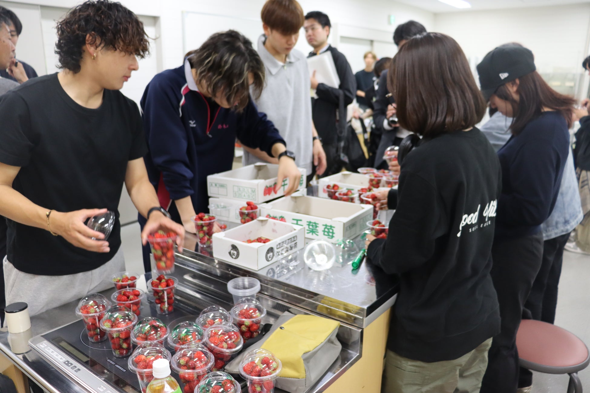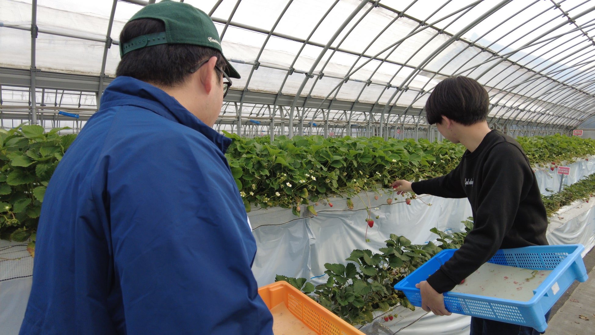収穫、販売に参加した経営情報学部3年松尾颯太さんは、「実際にイチゴ園での収穫をしてみると、プライベートのイチゴ狩りとは異なり、収穫量が多く、採集のしかたも難しいので大変だった。それを自身の手で販売したときの達成感があった」と語ってくれました。