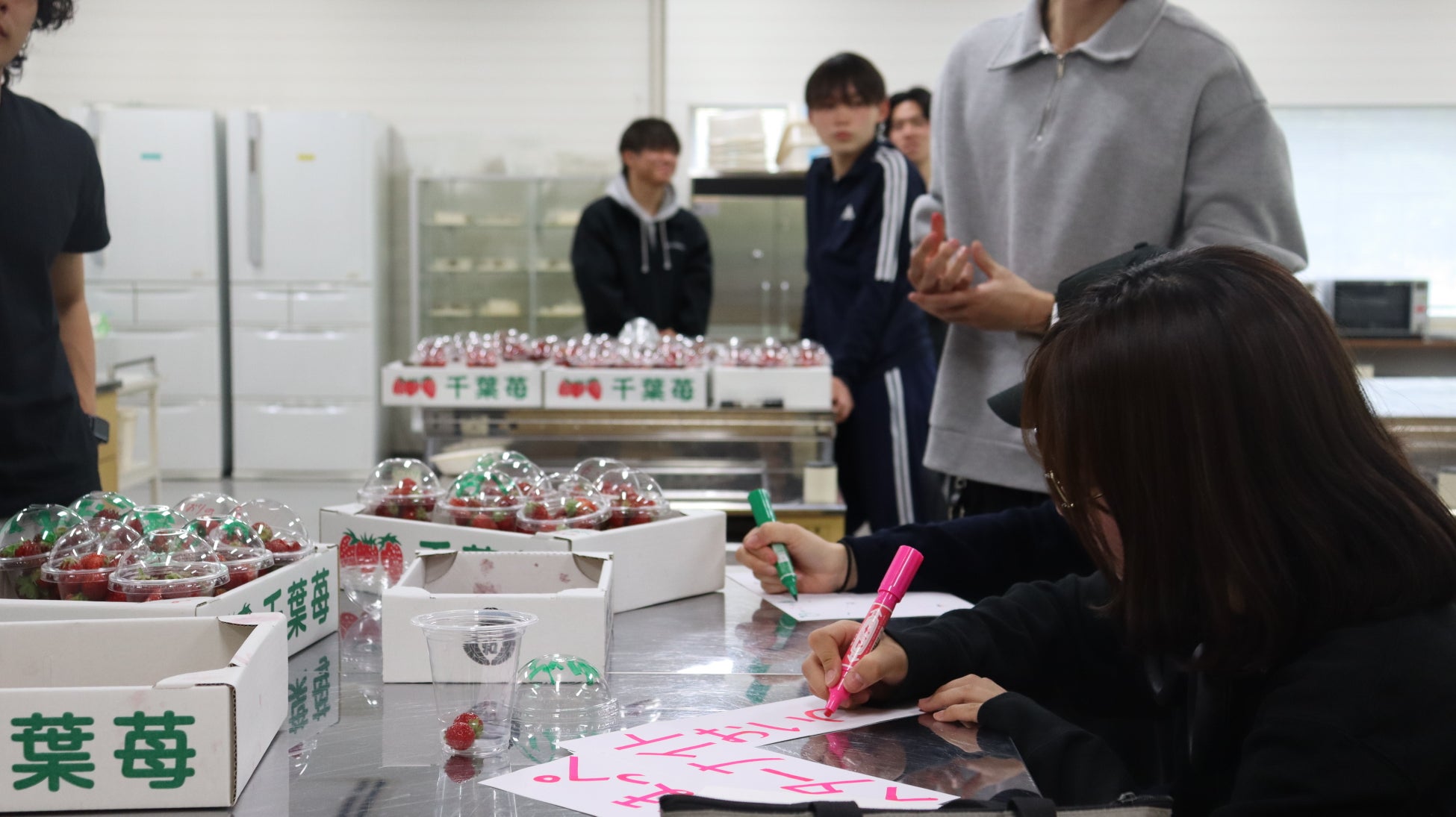 学生たちは収穫・選別、パック詰め、販売にかかわるメンバーのシフト管理やイチゴの値付け、POP作成、販売など、収穫~消費者の手に届くまでの過程を自分たちで行いました。販売方法にも工夫を凝らし、各日100パック近く、需要と供給のバランスを考えながらの販売をしてきました。1日3、4品種を販売する中で、最終日には各品種の味の特徴も踏まえた接客トークを交えながら、完売に繋げていました。