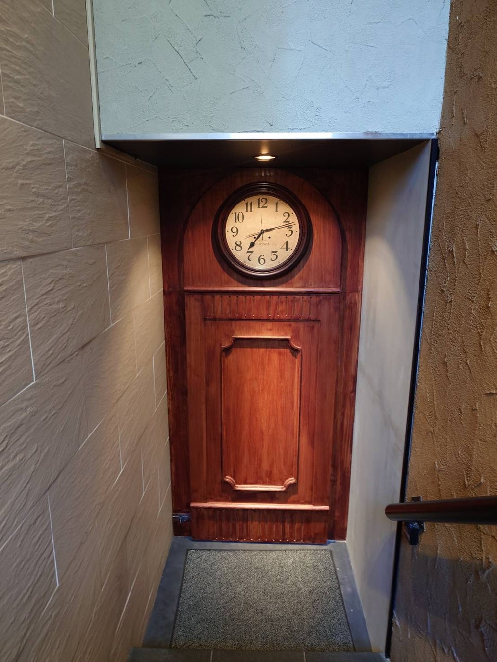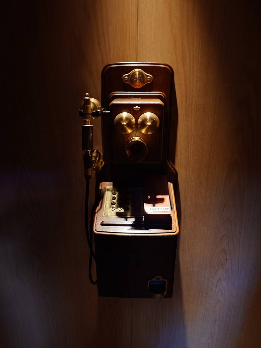 入口にはいくつかの仕掛けがあります。日本の歴史を感じる大きな古時計が入口となっており、時計の中に入ると古い公衆電話に仕掛けがしてあり入店できるようになっています。