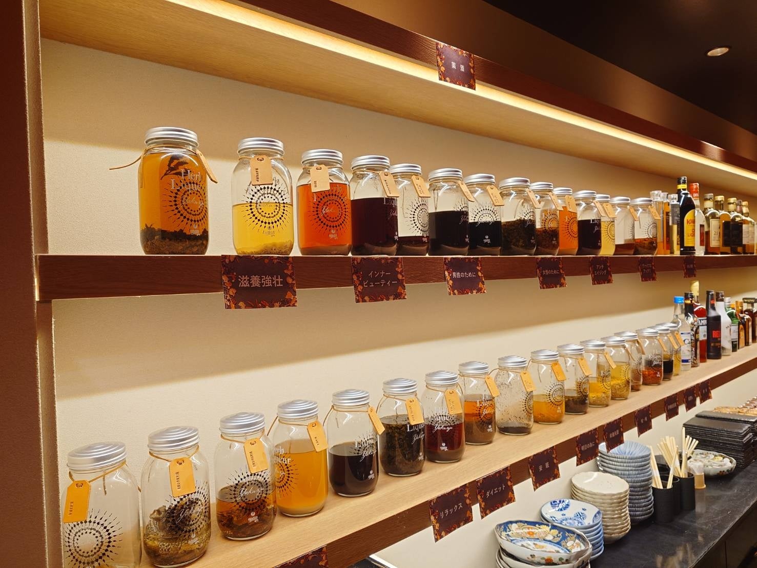 薬草の生命力と古人の智慧をアルコールに浸漬し、お客様自身のカラダとココロのバランスを整える事ができるお酒です。美容、健康、滋養強壮など、お酒を飲みながらも薬膳効果が得られる、日本らしい贅沢なお酒を全30種類ご用意しました。お好きな割り方でお楽しみください。