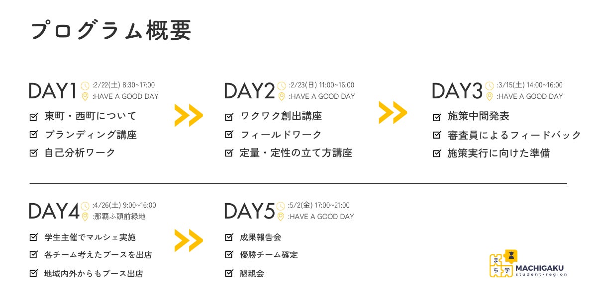 本プロジェクトは、沖縄県那覇市東町・西町エリアを舞台に県内企業と共同で地域の魅力を発掘・発信する実践型プロジェクトです。企画を実行する際に必要なビジネス視点を参画企業の方から直々に学び、学生自身がフィールドワークやヒアリングを通じて地域の魅力を発掘、それをもとにマルシェ企画の立案・実行までを行うというプログラム内容になっています。本プロジェクトを通じ、学生ならではの視点で、まちの未来をつくる一歩を共に踏み出すことを呼びかけます。
