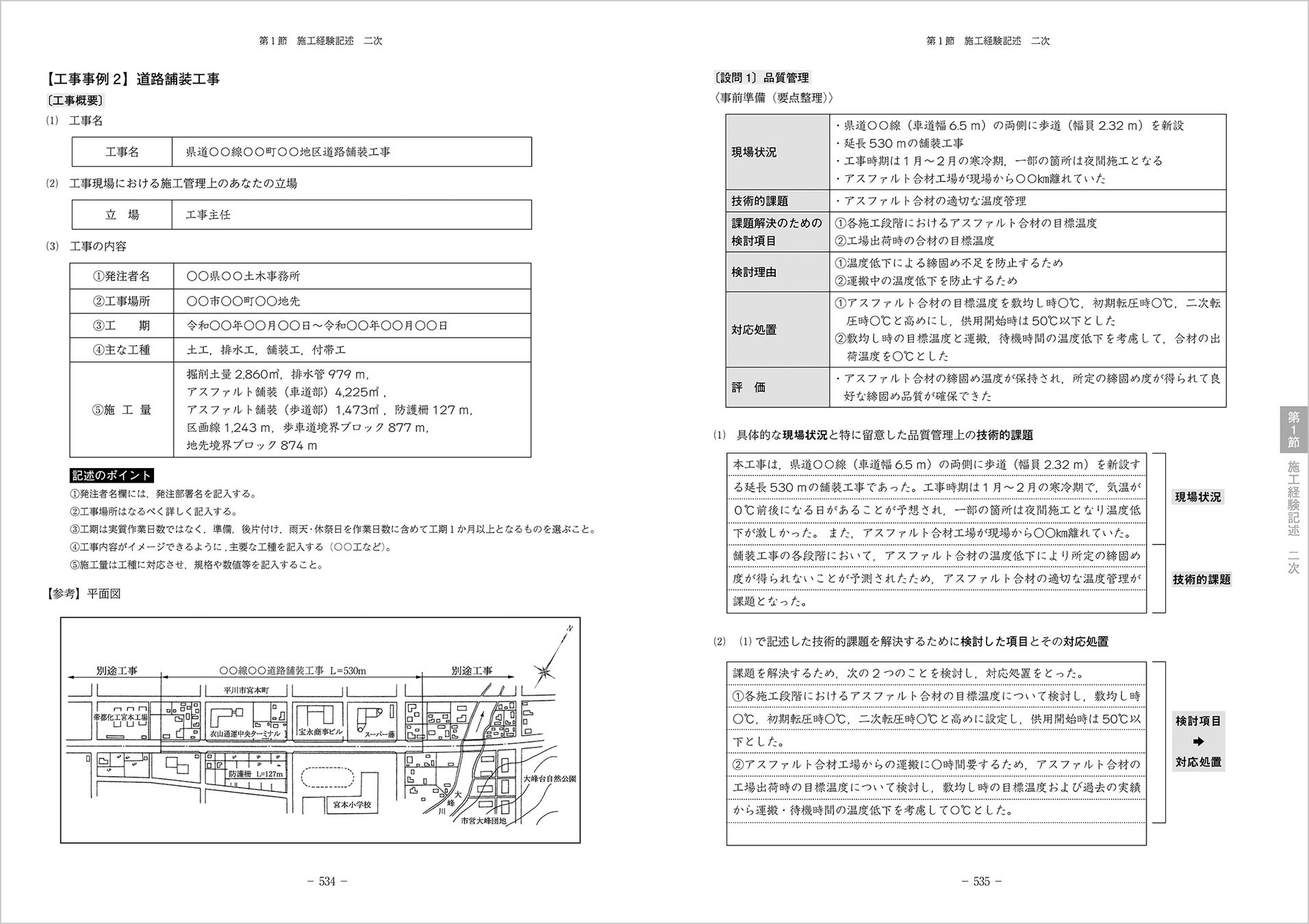 第二次検定では、問題1の施工経験記述の出題形式が変更されました。前年度までは品質管理、安全管理、工程管理の管理項目から選択し記述する形式でしたが、令和6年度は「品質管理」と「工程管理」の両方について記述させる形式でした。本書では、令和6年度の出題をもとに記述例を2つずつ掲載しています。