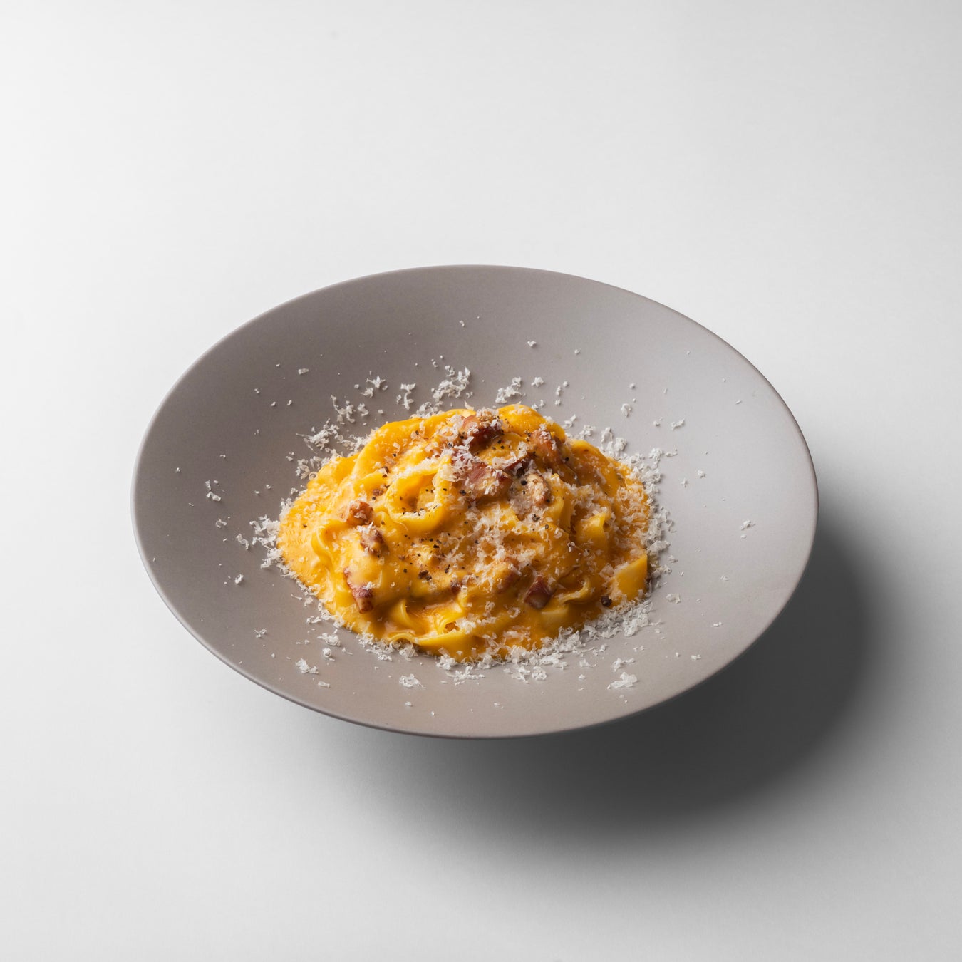 メニュー名:卵のカルボナーラとひき肉、フレッシュトマトとバジルの香りを添えて