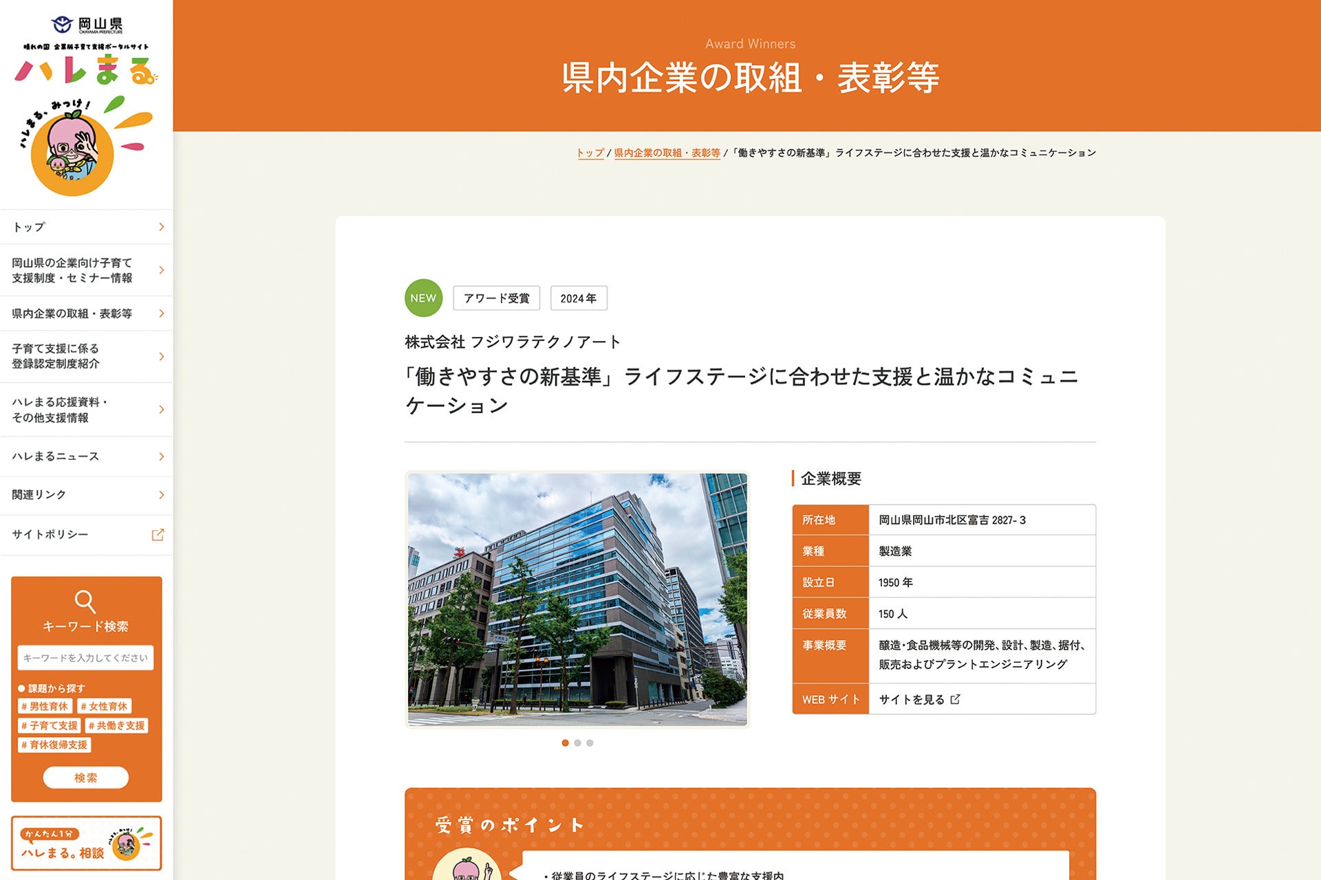 晴れの国おかやまで、安心して子育てと仕事を両立できる職場づくりにつながる”ハレまる。”の取組を進めている企業を見つけ、その素晴らしい取組等を紹介していきます。