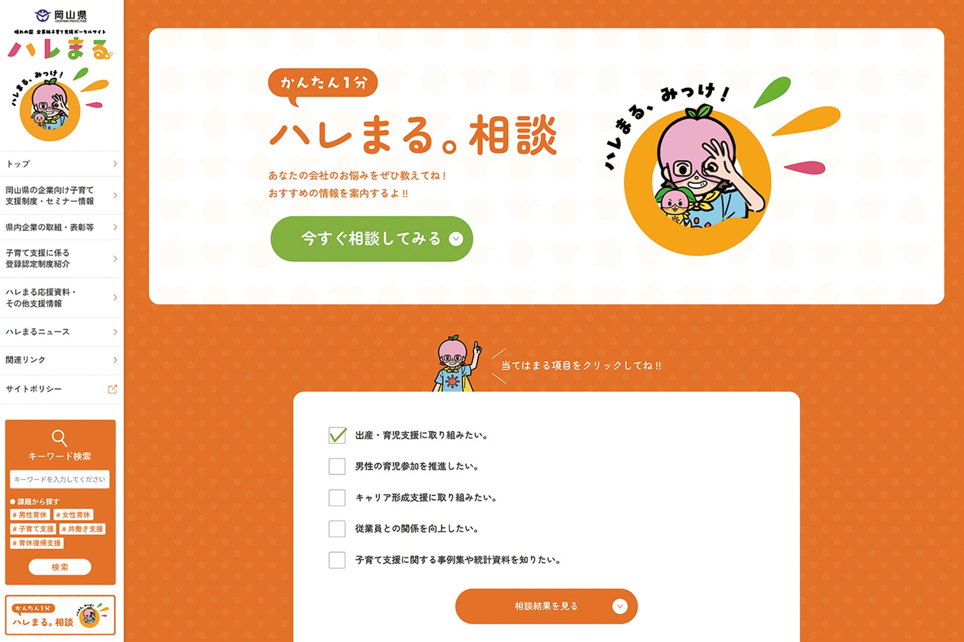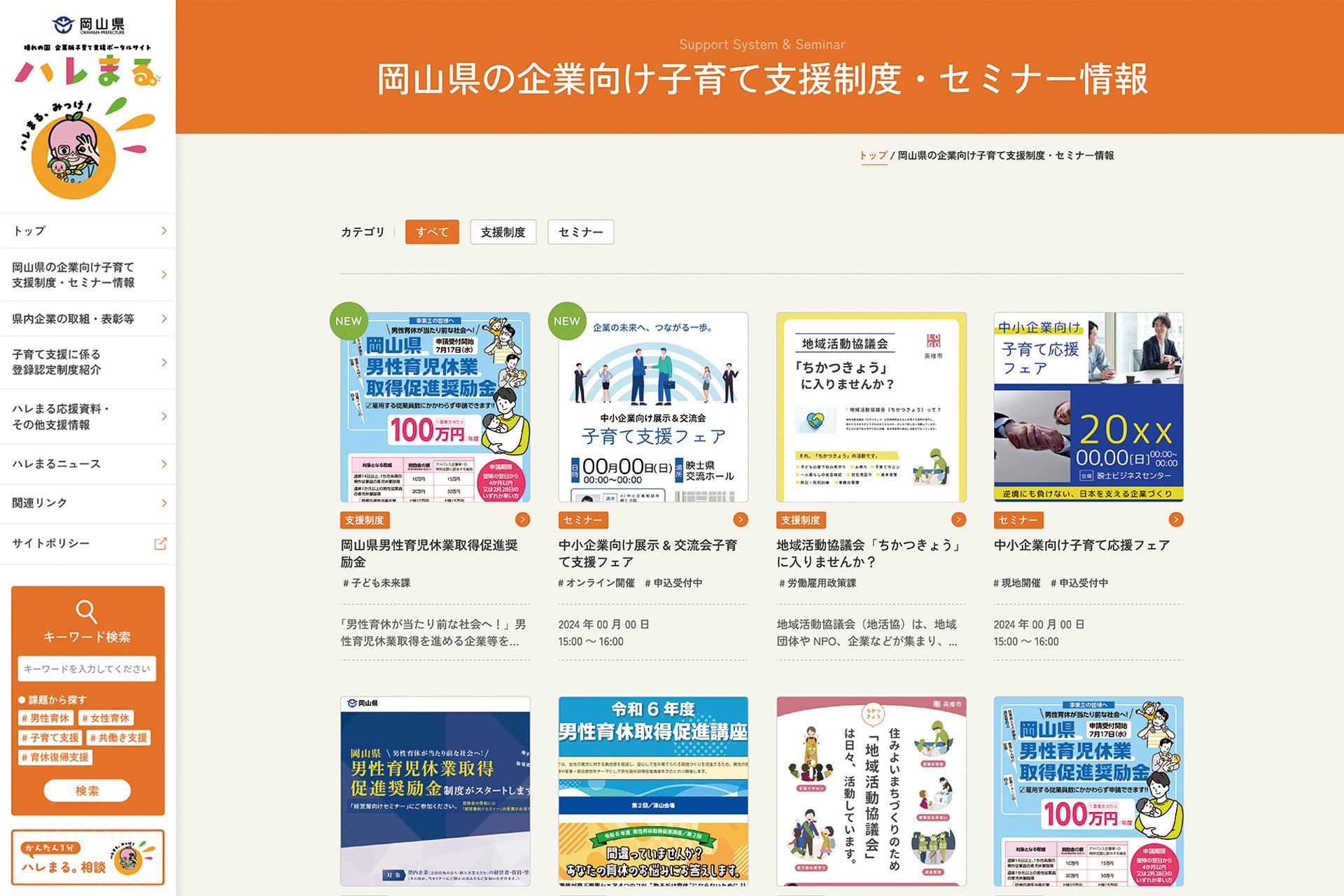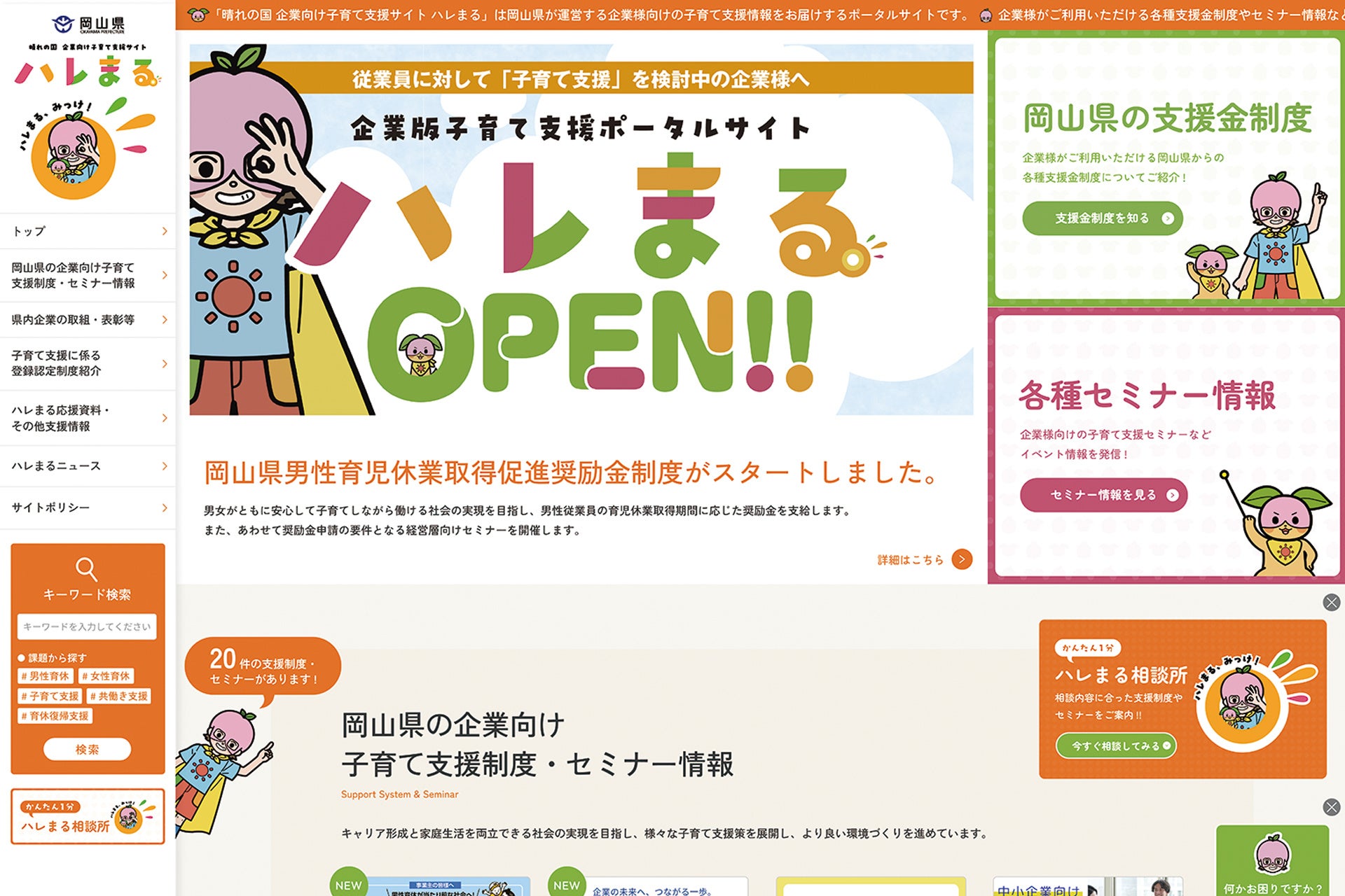 「ハレまる。」は、岡山県が運営する、企業向けの子育て支援情報を総合的に発信するポータルサイトです。県内企業が先進的に進めている効果的な取組や県などが実施するセミナー、国や市町村を含めた補助制度の情報等を掲載しており、そうした情報の中から、各企業の関心や課題に応じて、おすすめの取組や支援制度等をピックアップして紹介する独自の機能も備えています。