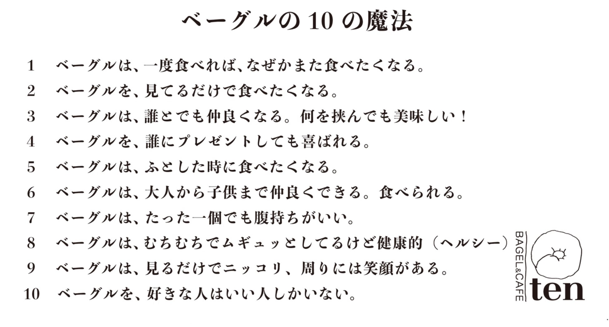 『BAGEL&CAFE ten(ベーグル アンド カフェ テン)』は、「ベーグルの10の魔法」で笑顔を創り続けたいをコンセプトに、自家製・自然発酵・自然の美味しさを大切に、毎日一つ一つお店で焼き上げたベーグルが自慢のカフェです。“ベーグル”という、まるで呪文の様な言葉に10のハッピーな魔法を込めて、お客様に届けて参ります。そして、私たちが大切にする10のビジュアルをロゴメインに置き、店舗名を10=tenと名付けました。