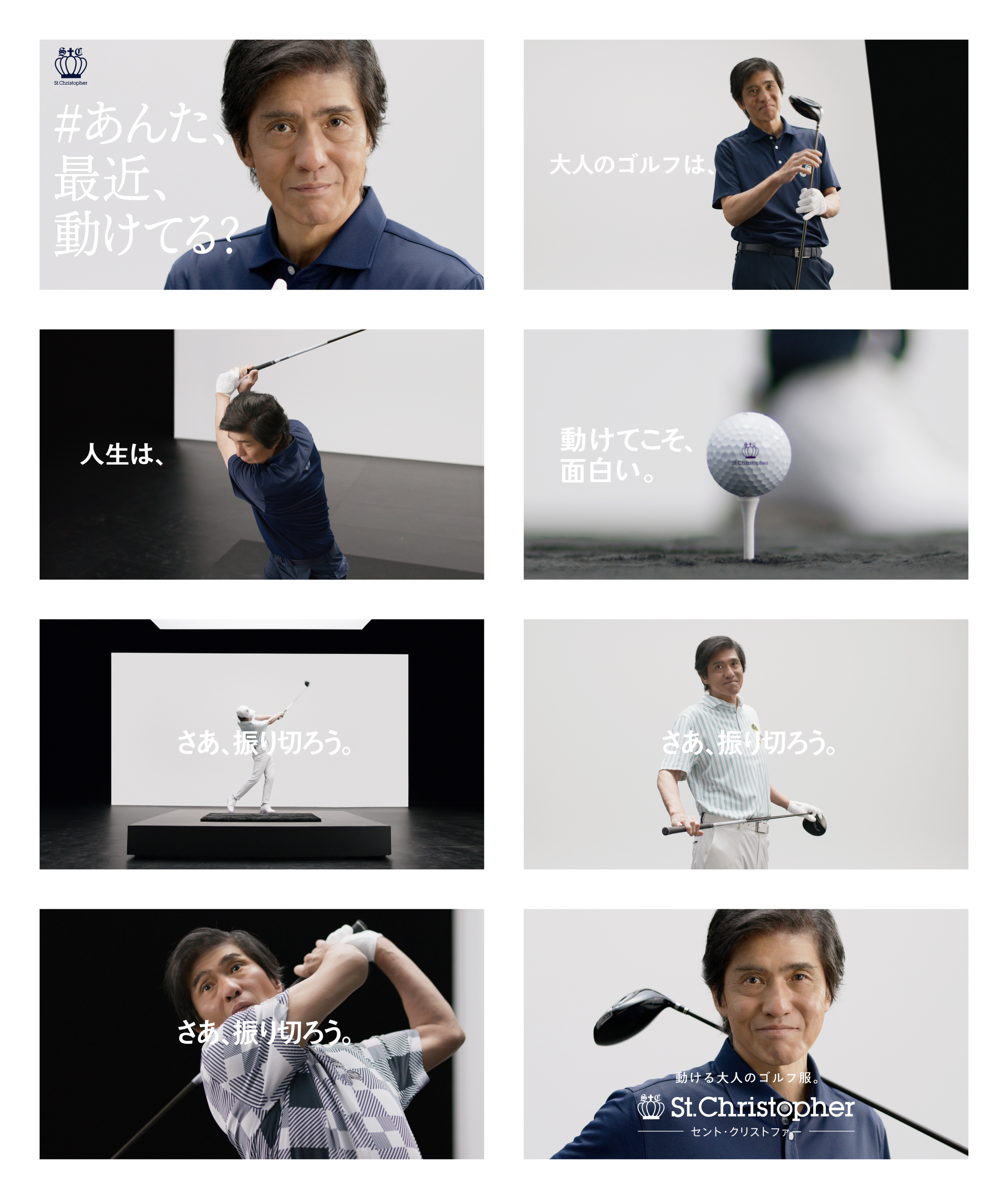 佐藤浩市さんがカメラ越しに語りかける印象的なシーンから始まる本CM。白と黒のコントラストが美しいスタジオ空間の中で、渾身のフルスイングを披露します。様々なアングルから映し出されるのは、全身の躍動感と上質なウェアの存在感。力強さと優雅さが響き合う、佐藤浩市さんの大人な「動き」と「着こなし」にご注目ください。