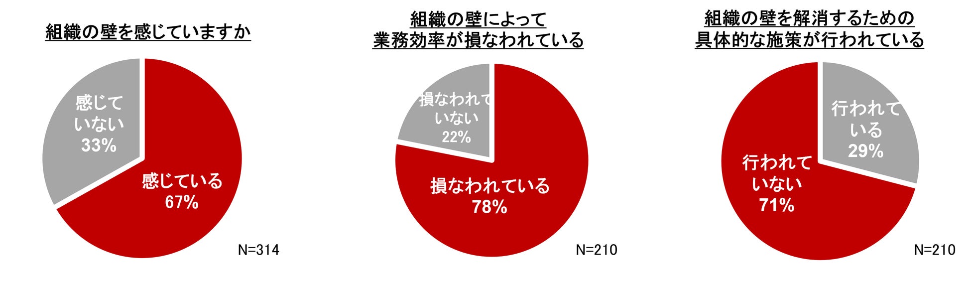 【組織の壁】 「組織の壁」を感じている人が多く、業務効率も損なわれているが、対策はとられていない