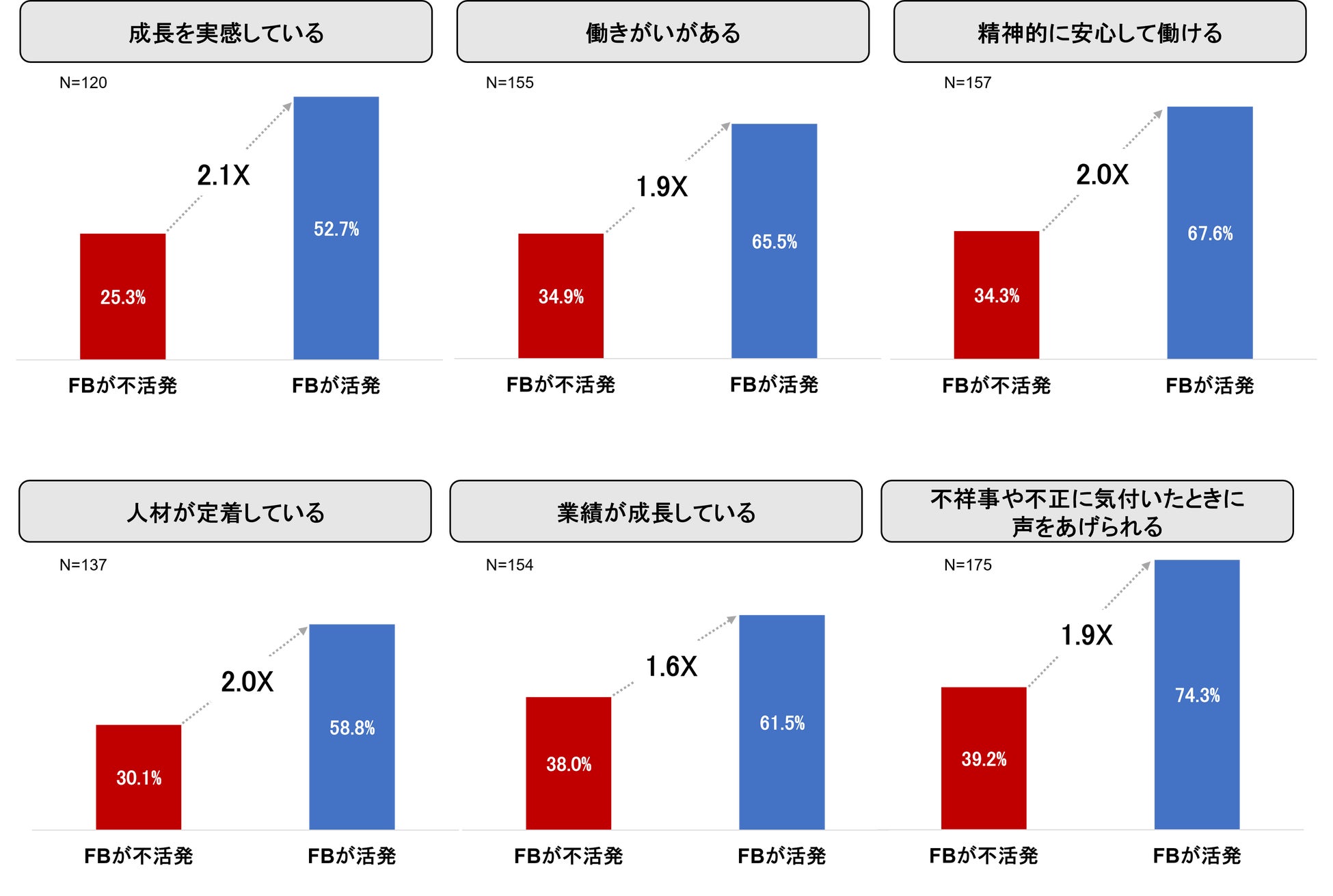 さらに、フィードバックが活発な組織とそうでない組織を比較すると、フィードバックが活発な組織では、「自身の成長を実感している」割合が2.1倍、「働きがいがあると感じる」割合が1.9倍、「精神的に安心して働ける」割合が2.0倍と、フィードバックが活発でない組織に比べ、いずれの項目でも高い結果となりました。