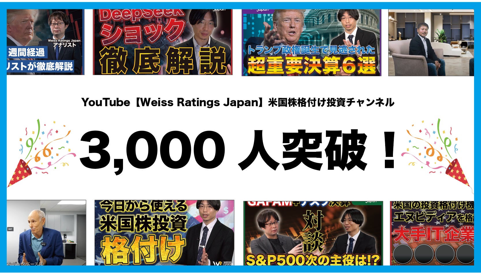 2025年3月、株式会社Wealth Onが運営する米国株特化型YouTubeチャンネル「【Weiss Ratings Japan】米国株格付け投資」は、このたびチャンネル登録者数3,000人を突破いたしましたことをお知らせいたします。