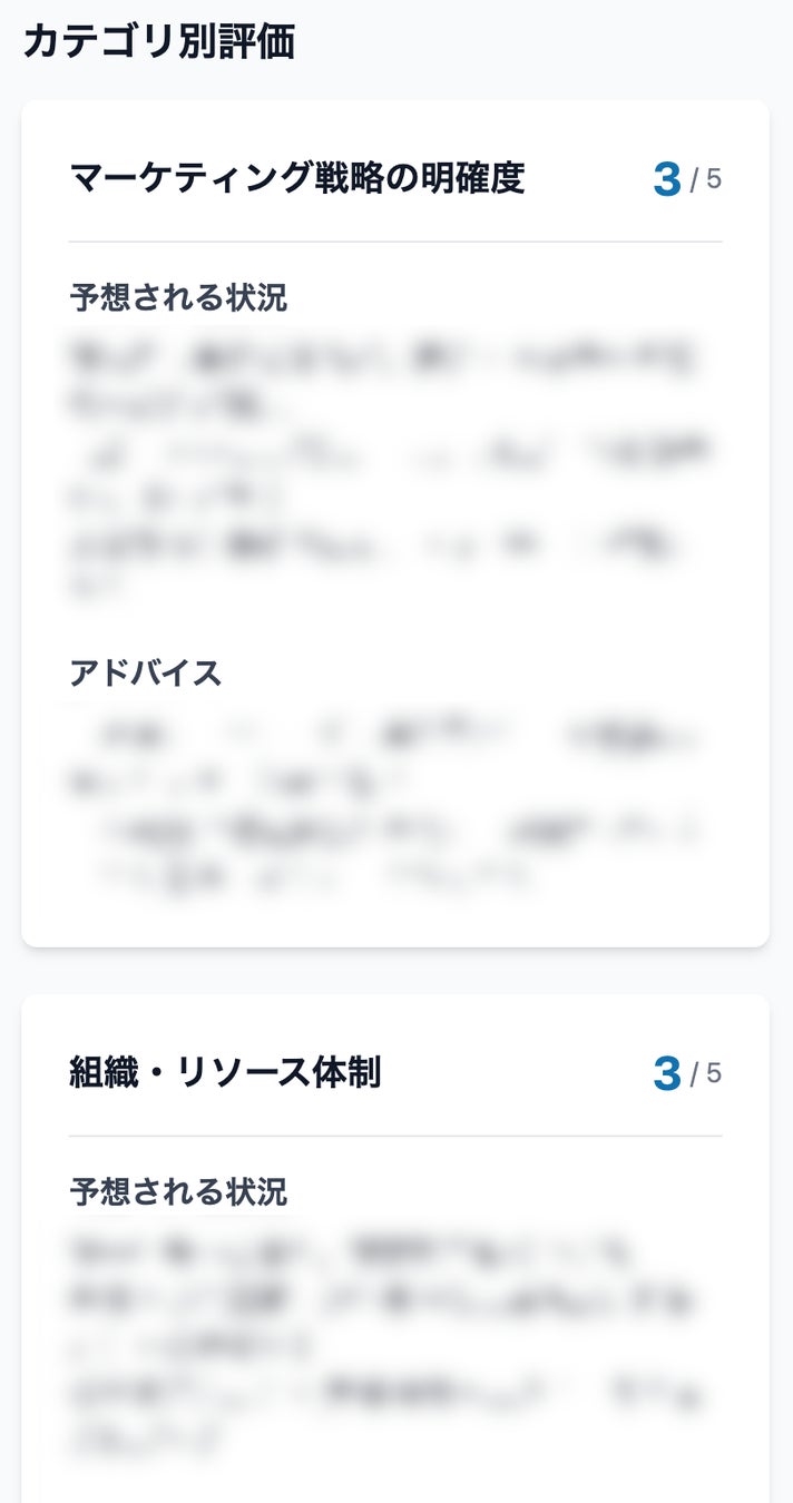 20問の設問に回答すると、その場で各カテゴリごとの“評価”と“予想される状況”“改善アドバイス”を表示。業務の合間に気軽に取り組め、即実行につなげられるヒントが得られます。