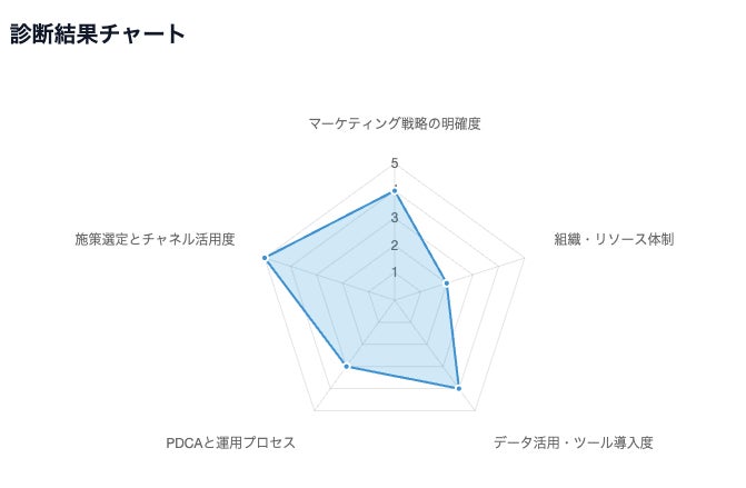 「マーケ戦略の明確度」から「施策選定・チャネル活用度」まで、チーム運営や施策の実行度合いを幅広く診断。自社の強み・弱みを客観的に把握できます。
