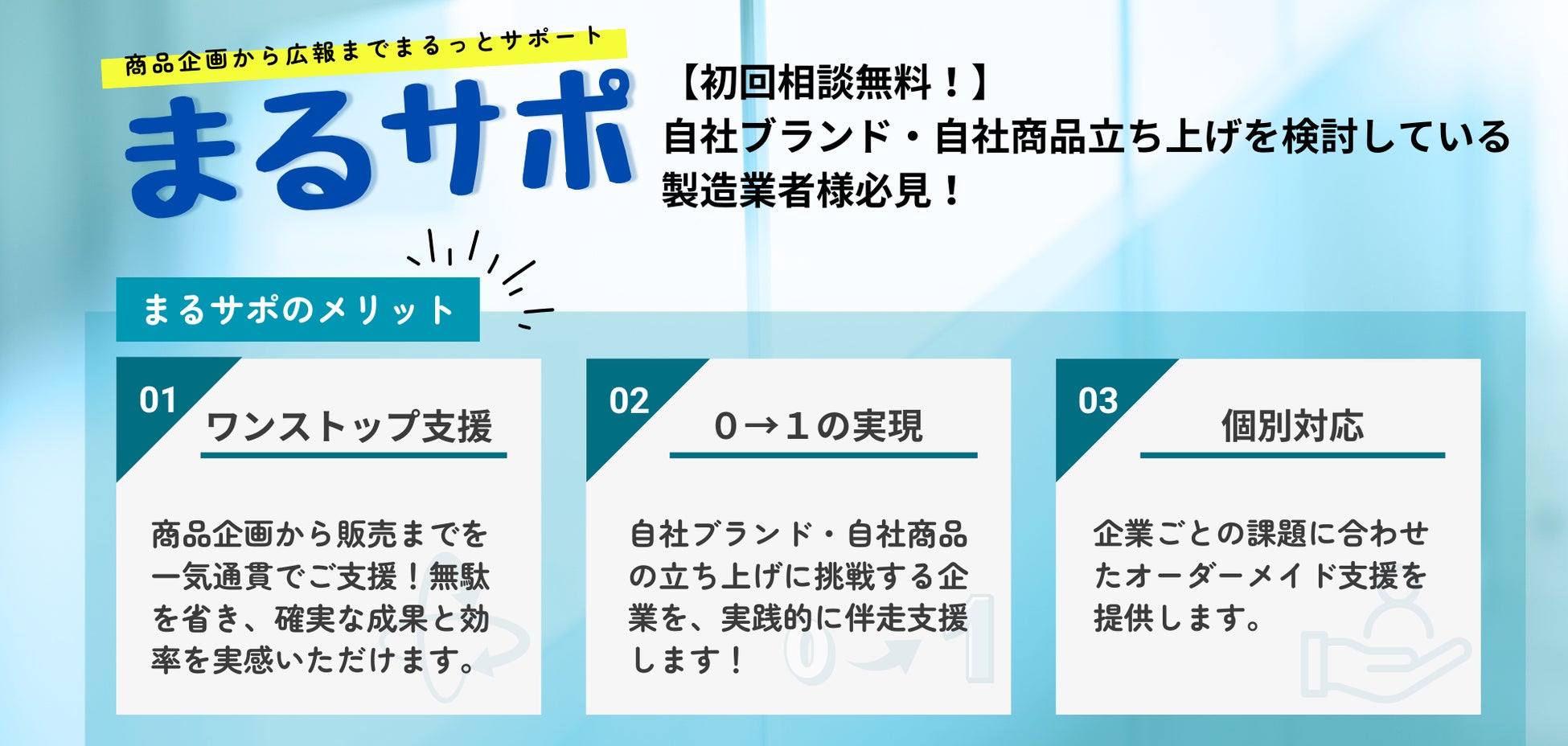 『まるサポ』は、そんな企業のために誕生しました。技術力を持つ企業が自社ブランドを確立し、成長できるよう、実践的な支援を提供します。単なるアドバイスではなく、具体的な企画立案から販売戦略まで伴走し、確実に前進できるようサポートします。